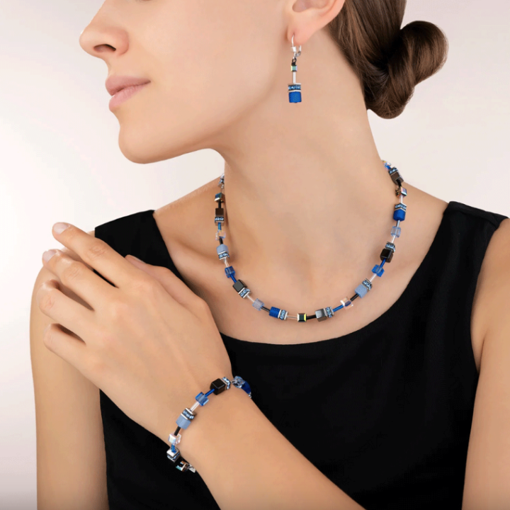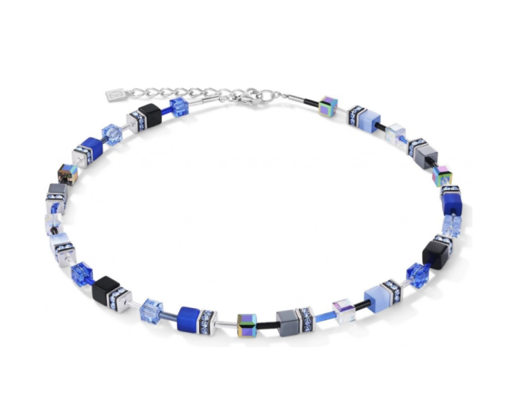 Náhrdelník dominuje čiernou a modrou farbou, ktorá je doplnená priehľadnými kamienkovými rondelmi a známymi Swarovski krištáľmi, dodávajúc šperku eleganciu, zatiaľ čo sa geometrické tvary štvorca starajú o jeho čistý a prepracovaný dizajn. Tento náhrdelník je vyrobený z ušľachtilej ocele, ktorá Vám zaručí dlhú životnosť tohto skvostného šperku, na ktorej si značka COEUR DE LION zakladá.