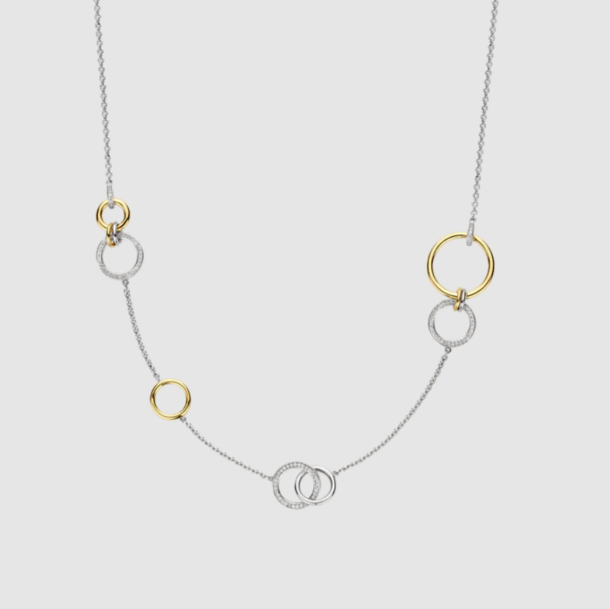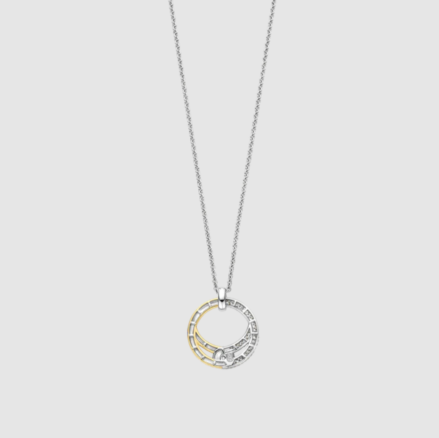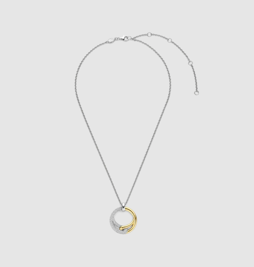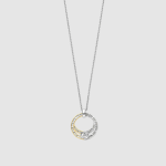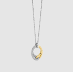 Tento elegantný náhrdelník s kruhovým dizajnom prívesku pozdvihne každý vzhľad. Tri splývavé stuhy – dve z bielych kubických zirkónov osadených pavé a jedna z lešteného zlata – sa prepletajú a vytvárajú elegantnú slučku, ktorá symbolizuje harmóniu a nekonečnú krásu. S priemerom 24 mm vytvára prívesok rafinovaný, no zároveň pútavý výraz, zavesený na jemnej striebornej retiazke, ktorá pohodlne sedí pozdĺž výstrihu. Brilantné pavé osadenie zachytáva a odráža svetlo zo všetkých uhlov, čím dodáva žiarivý lesk bežnému aj príležitostnému noseniu.