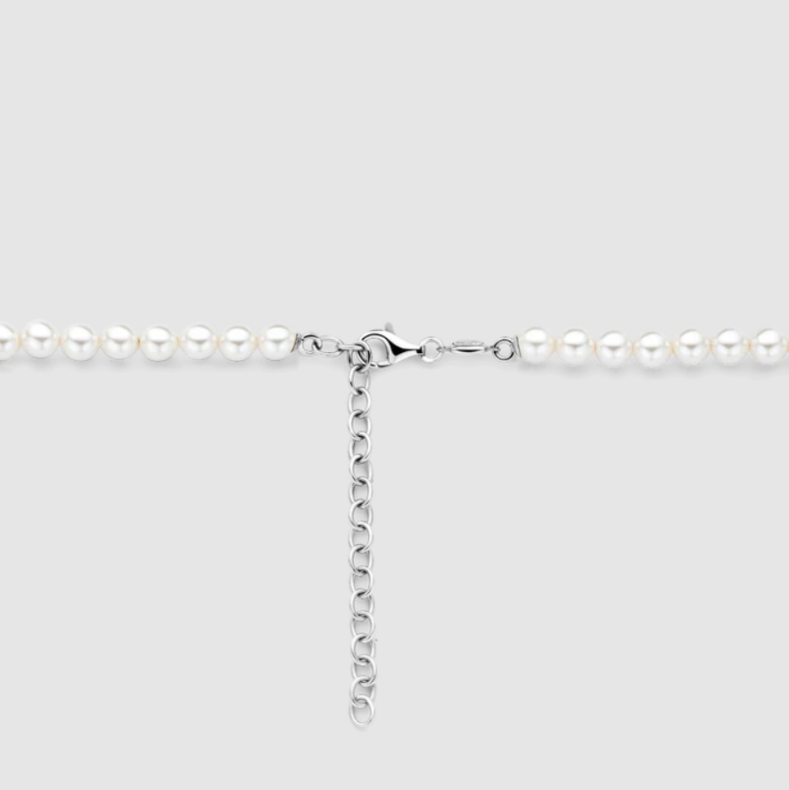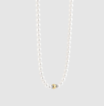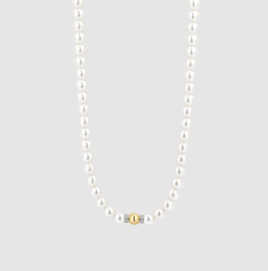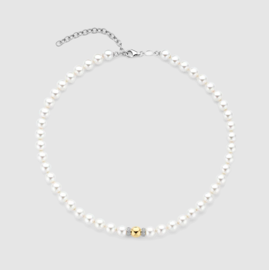 Nadčasový náhrdelník so šnúrou žiarivých bielych perál elegantne zvýrazňuje leštená žlto pozlátená guľa, lemovaná pavé kubickými zirkónmi, ktoré sa jemne trblietajú pri každom pohybe. Harmonická rovnováha svetla, formy a textúry pozdvihuje klasický perlový náhrdelník na rafinovaný moderný vzhľad.