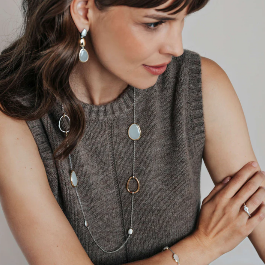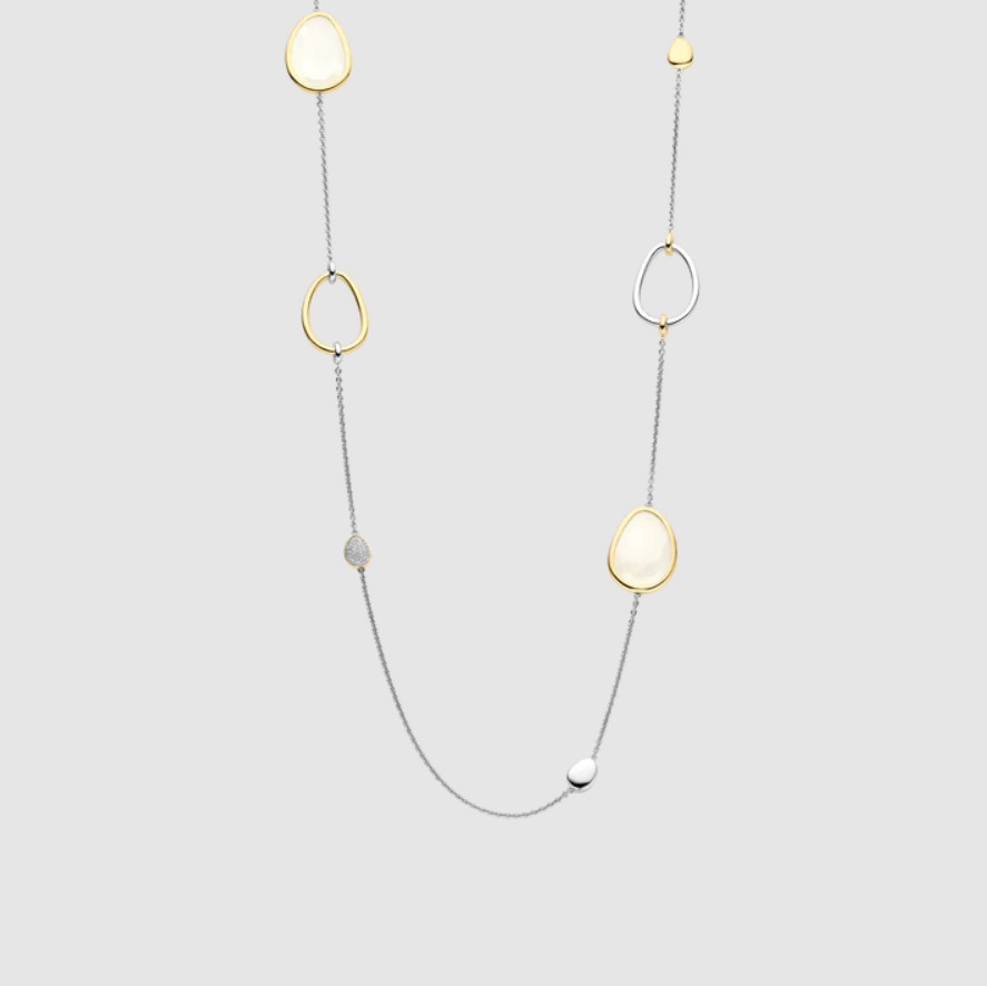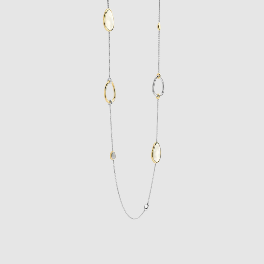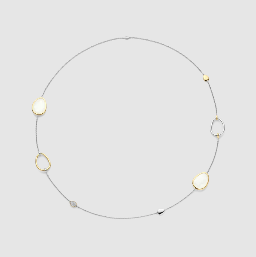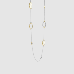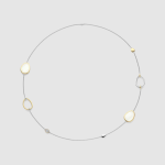 Objavte organický rytmus s týmto dlhým náhrdelníkom, kt. sa vyznačuje elegantnou súhrou asymetrických akcentov v tvare pedálov – niektoré sú osadené kubickými zirkónmi, iné sú zarámované žltým zlatom alebo leštenou platinou. Fazetované perleťové kamene dodávajú náhrdelníku lesklý, prirodzený lesk, ktorý umocňuje jemný a voľný charakter náhrdelníka. Zavesený na jemnej striebornej retiazke, každý prvok pôsobí starostlivo umiestnený, no zároveň hravo spontánne – odrážajúc pokojný rozptyl hladkých pedálov pozdĺž riečneho koryta.
