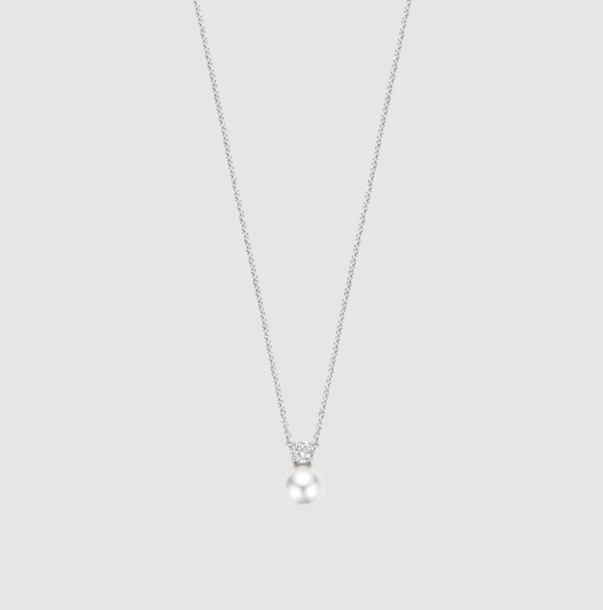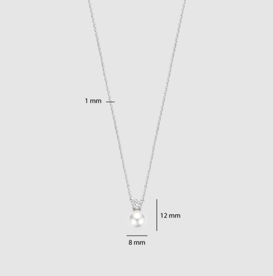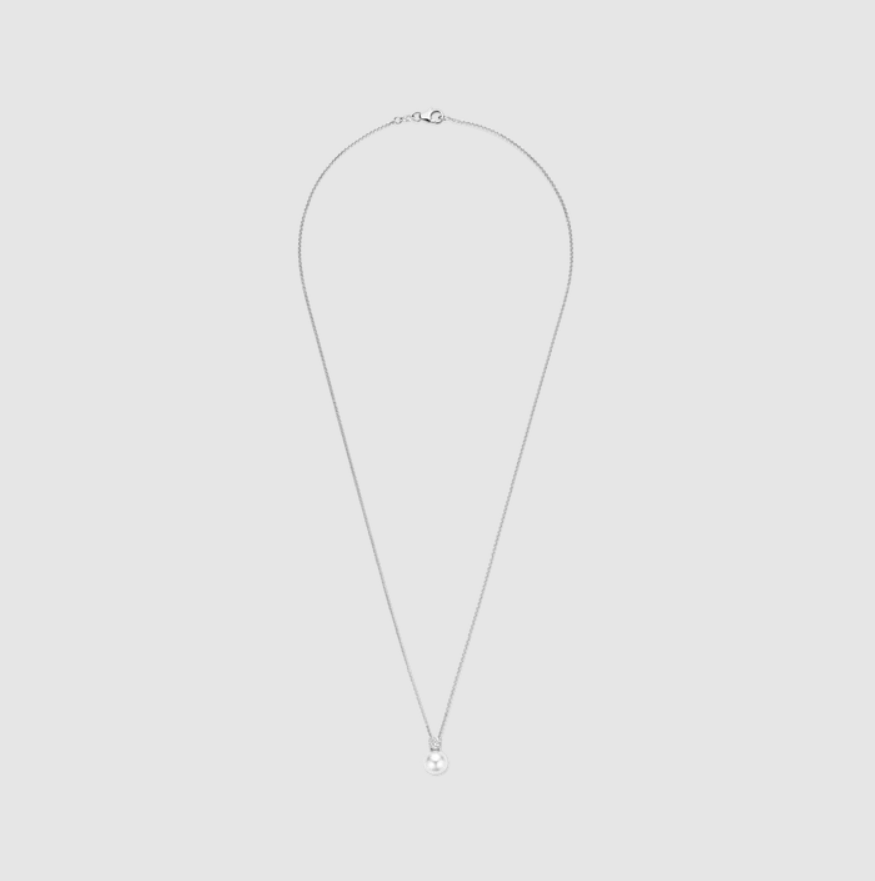 Tento strieborný perlový náhrdelník kombinuje brilantný zirkón vsadený do strieborného osadenia s perlou s krištáľovým jadrom. Zirkón dodáva jemný lesk, zatiaľ čo perla prináša jemný, žiarivý lesk. Kombinácia zirkónu a perly dodáva tomuto striebornému perlovému náhrdelníku rafinovaný a vyvážený charakter.