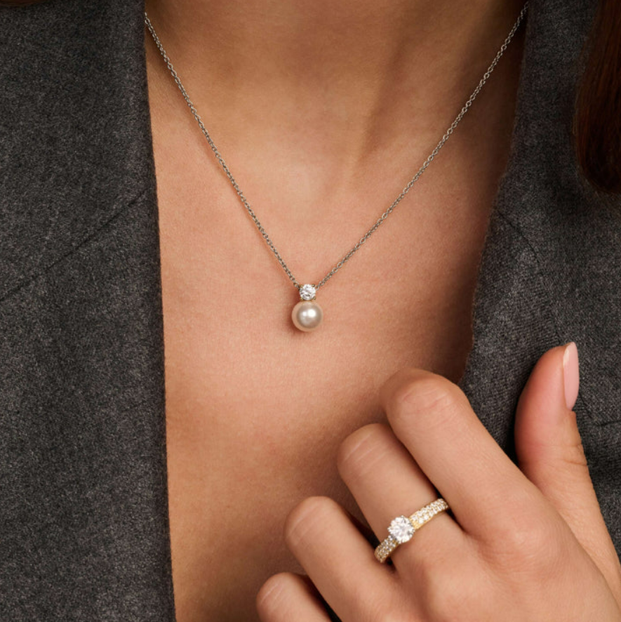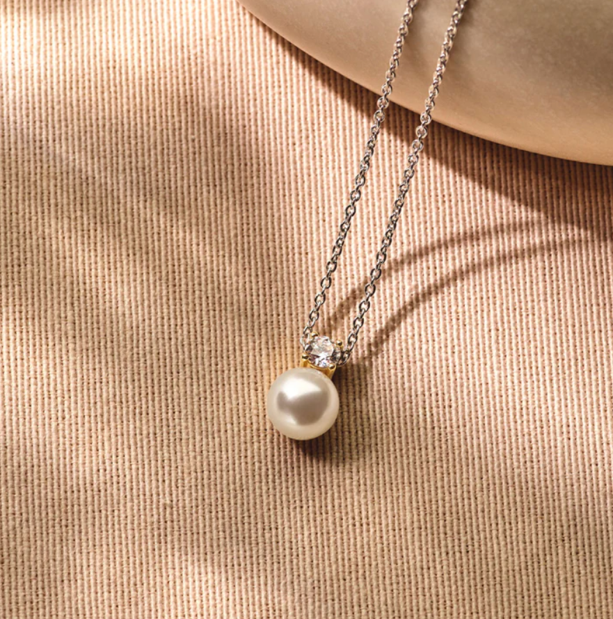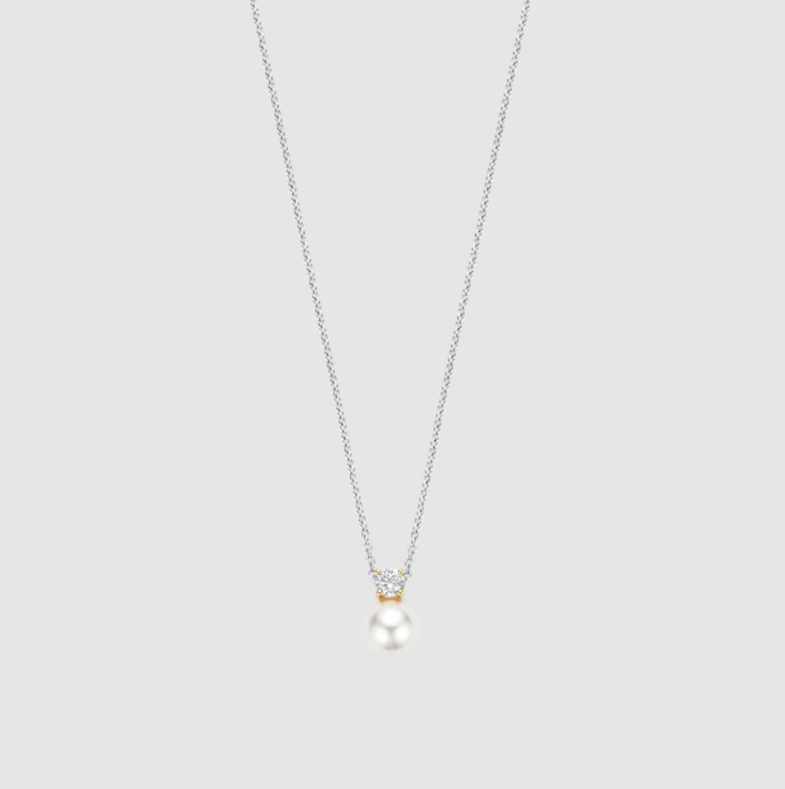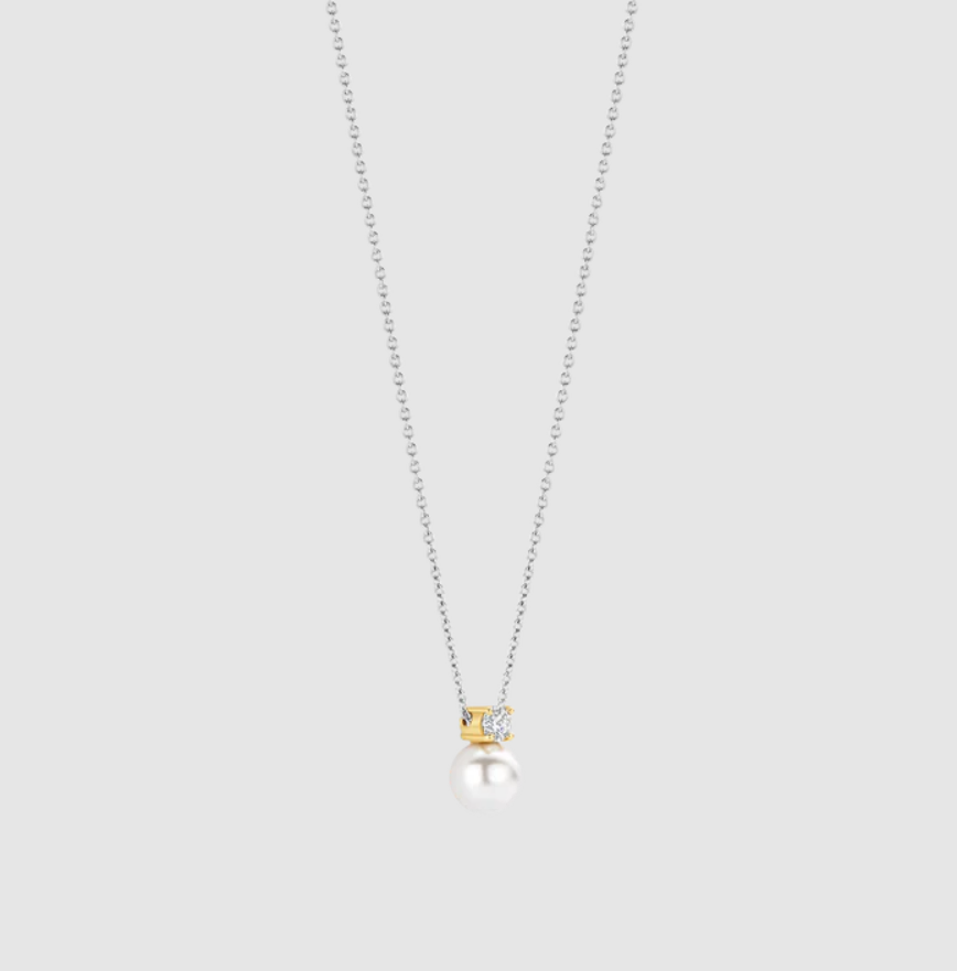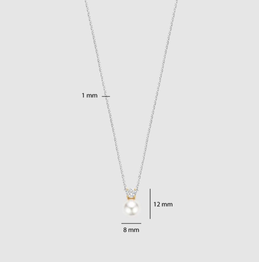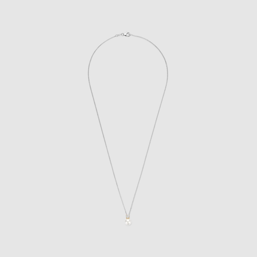 Tento náhrdelník s príveskom bielej perly s krištáľovým jadrom je jemným doplnkom, ktorého teplé pozlátené osadenie vytvára rafinovaný kontrast so striebornou retiazkou a zvýrazňuje trblietanie zirkónu. Spolu s jemným leskom perly dosahuje tento dizajn sofistikovaný a luxusný vzhľad. Jemná strieborná retiazka umožňuje, aby perlový prívesok krásne ladil so stredom výstrihu.