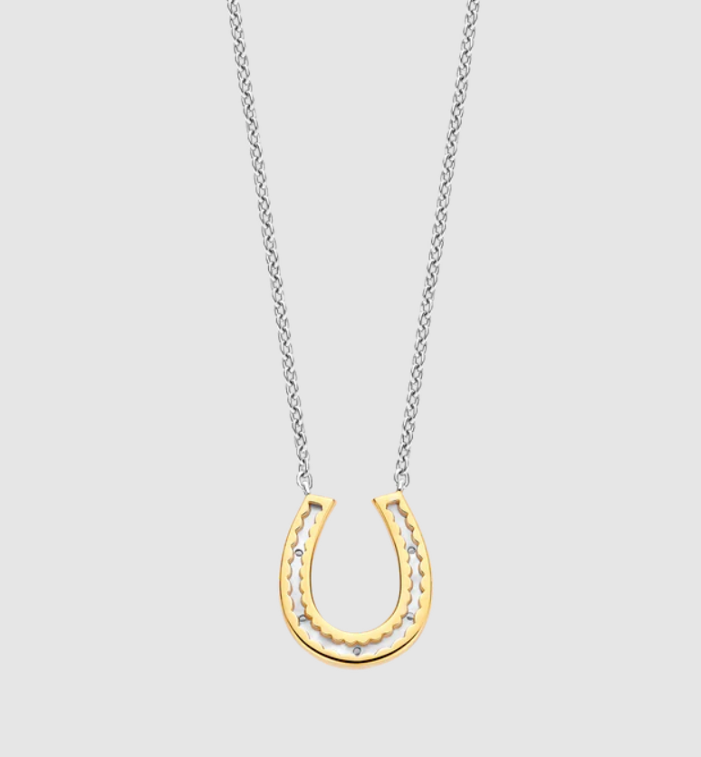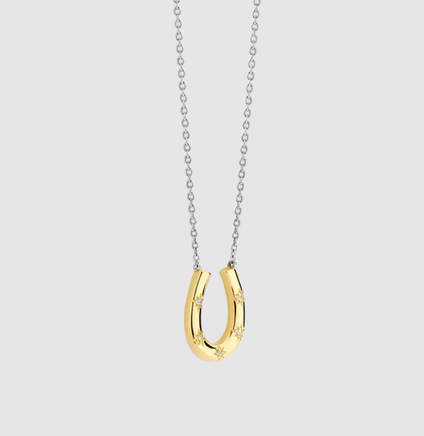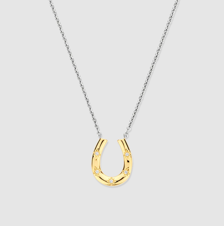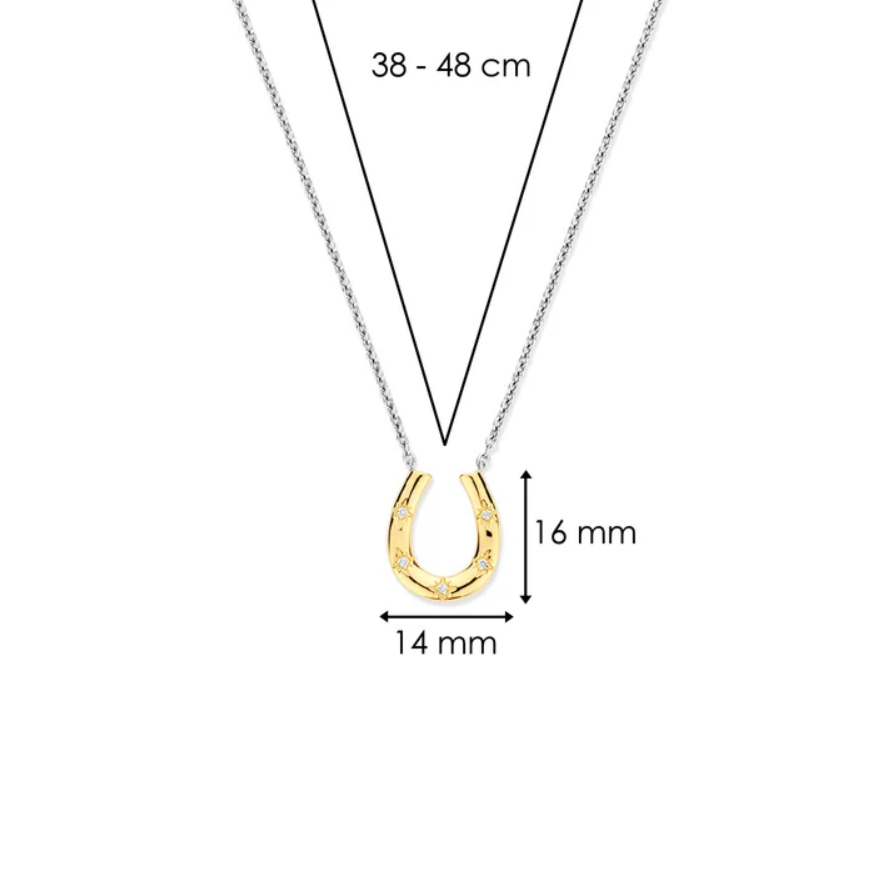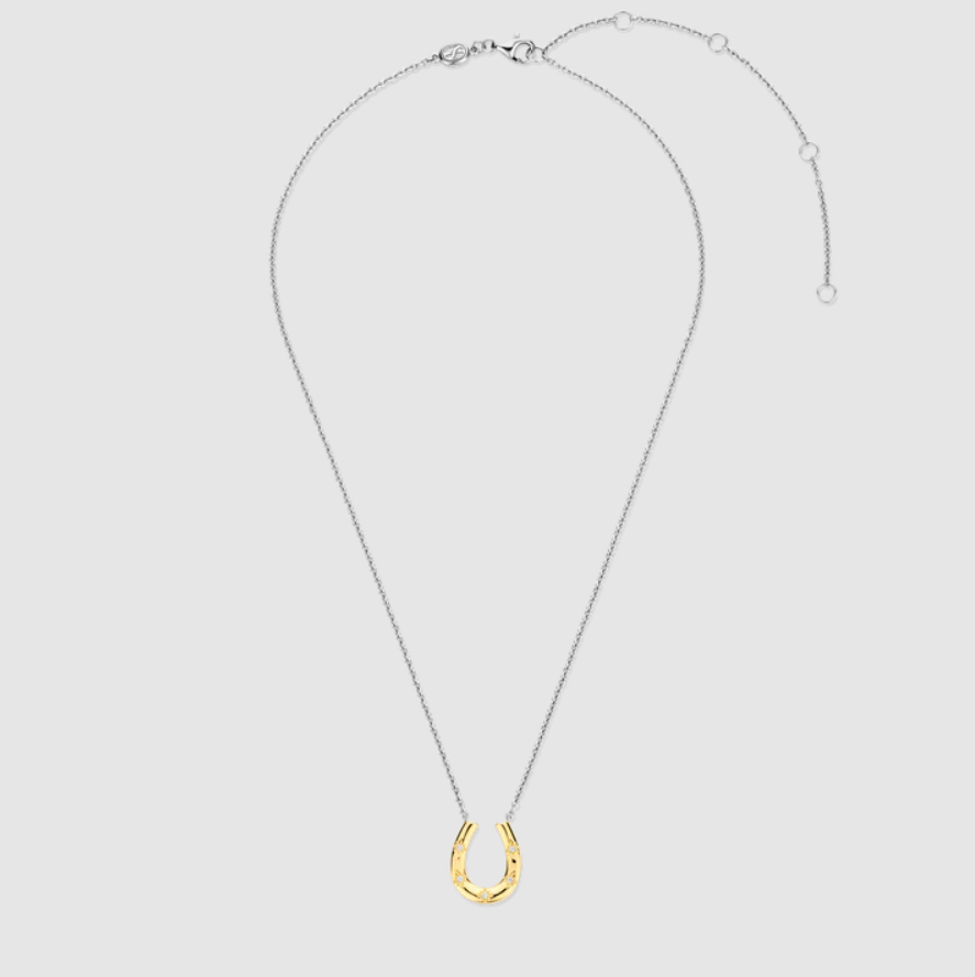 Prineste si šťastie s pozláteným strieborným náhrdelníkom v tvare podkovy, ktorý je navrhnutý tak, aby priniesol šarm aj eleganciu. Tento náhrdelník je pozlátený sýtym žltým zlatom a jeho prívesok v tvare podkovy je ozdobený trblietavým kubickým zirkónom pre jemný a podmanivý lesk. Zavesený na klasickej striebornej retiazke, vyžaruje nadčasovú sofistikovanosť
