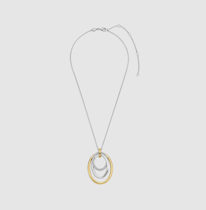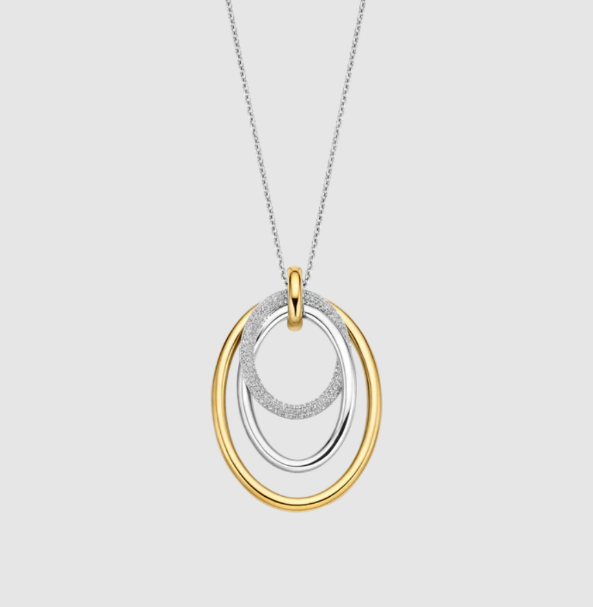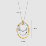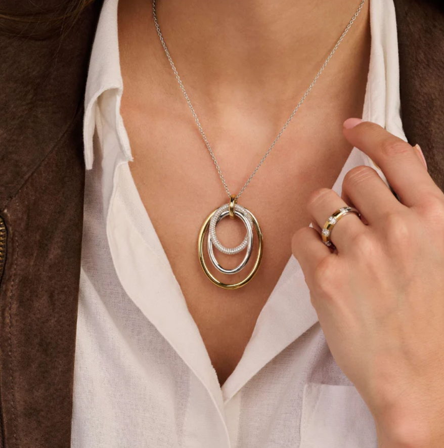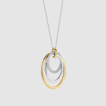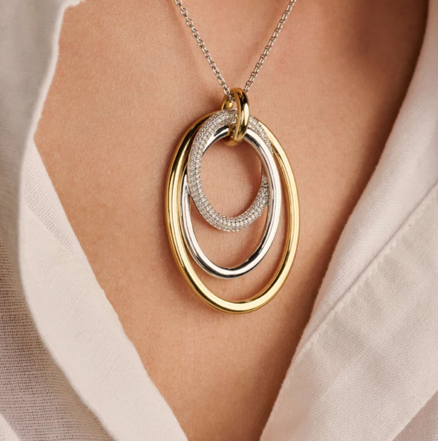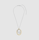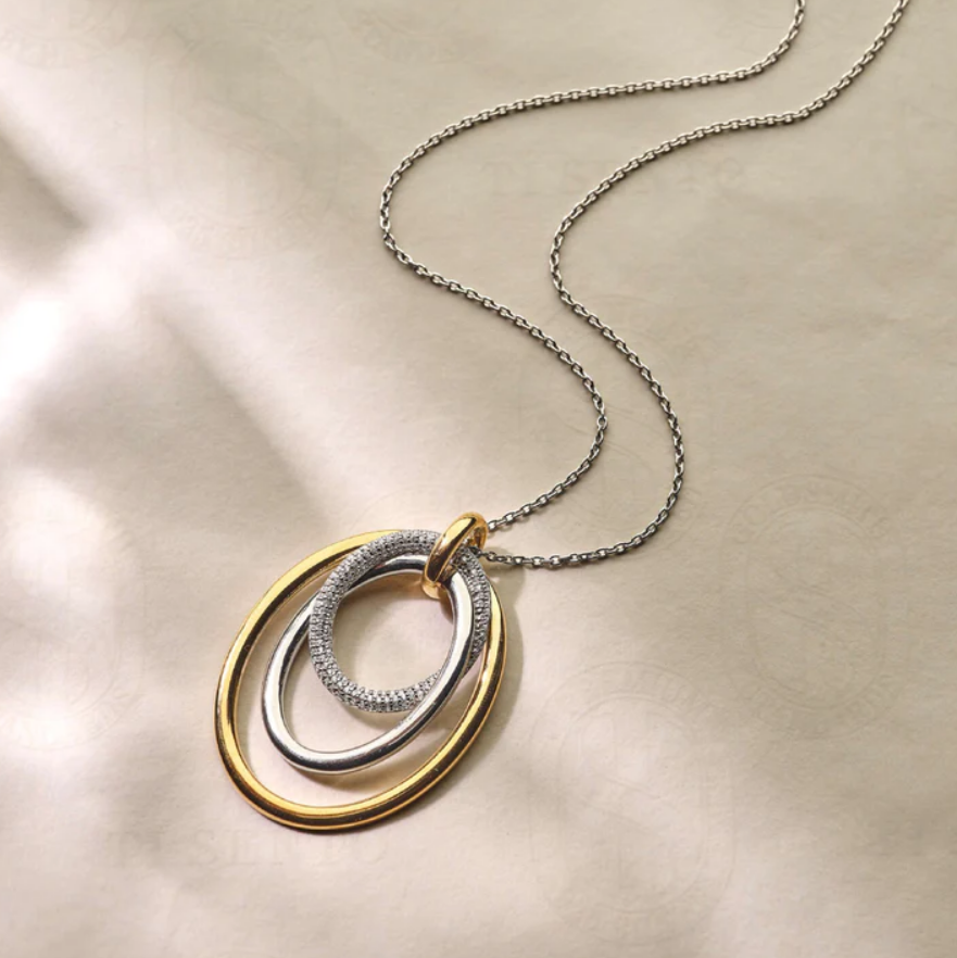 Tento prívesok dominuje príveskom, ktorý sa skladá z viacerých prepletených kruhov s rôznymi textúrami. Otvorený tvar a rozostupy medzi kruhmi umožňujú jemný pohyb prvkov, vďaka čomu náhrdelník krásne sedí pozdĺž výstrihu. Vonkajší kruh je z 18-karátového zlata vermeil, stredný kruh má hladkú striebornú povrchovú úpravu a najmenší kruh je osadený zirkónovými kameňmi. Kombinácia striebra, pozlátených akcentov a trblietavého zirkónu vytvára bohatý kontrast a výrazný vzhľad.
