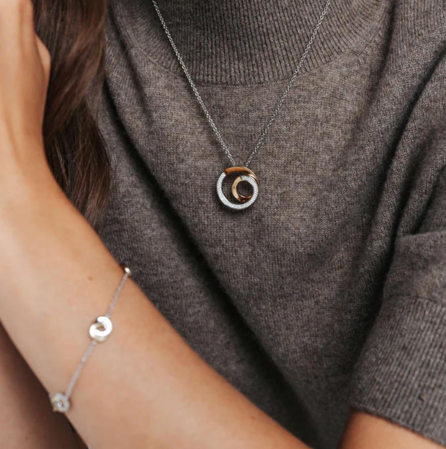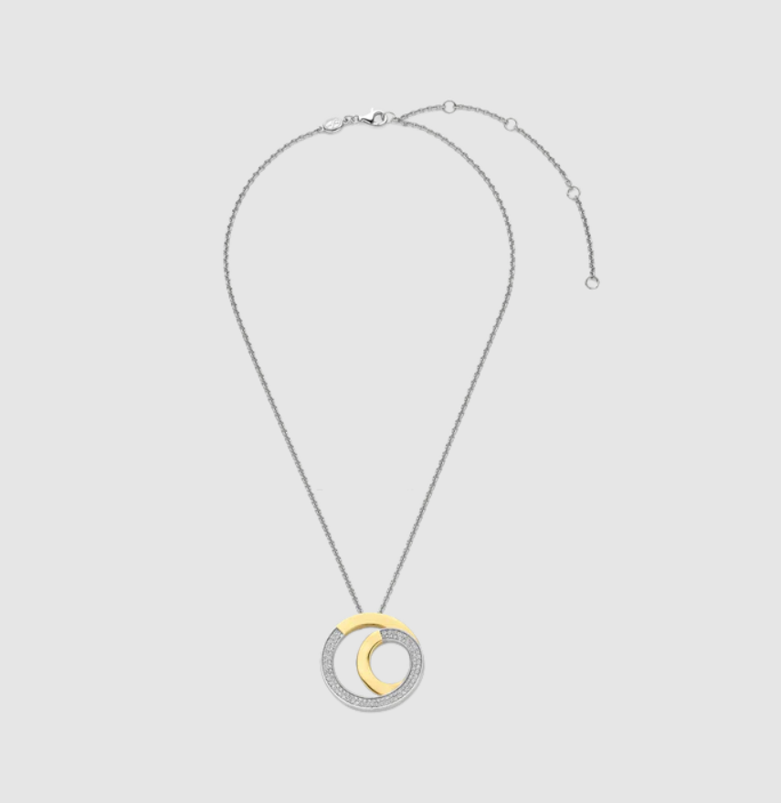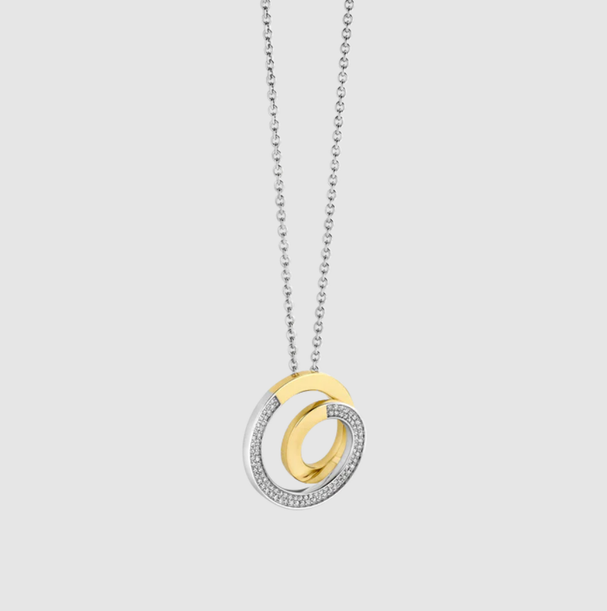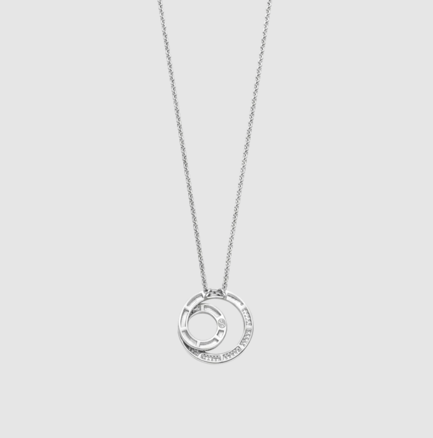 Tento nadčasový náhrdelník s príveskom zobrazuje dva prepojené kruhy – jeden z vysoko lesklého žltého zlata a druhý zdobený bielymi kubickými zirkónmi v pavé – ktoré vytvárajú fascinujúcu hru svetla, pohybu a textúry. Tento sochársky dizajn vyžaruje rafinovanú eleganciu, odráža architektonické krivky a nadčasovú symboliku. Motív otvoreného kruhu evokuje jednotu a plynutie.