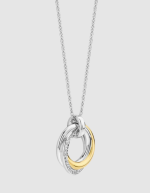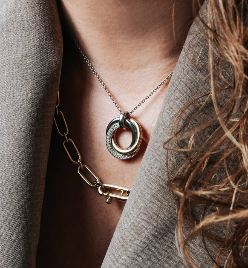 Výrazný náhrdelník s podmanivou súhrou textúr, pozlátený platinou pre trvácny lesk. Vyznačuje sa veľkým kruhovým dizajnom z prepletených vrstiev. Niektoré vrstvy sú pozlátené lesklým žltým zlatom, čo vytvára teplý kontrast s chladným striebrom zvyšku. Prepracované detaily a kontrastné textúry robia z tohto náhrdelníka skutočné umelecké dielo. Je to dokonalá fúzia moderného dizajnu a nadčasovej elegancie. Dodajte svojmu životu nádych úniku z reality a oživte svoj každodenný vzhľad týmto výnimočným kúskom.