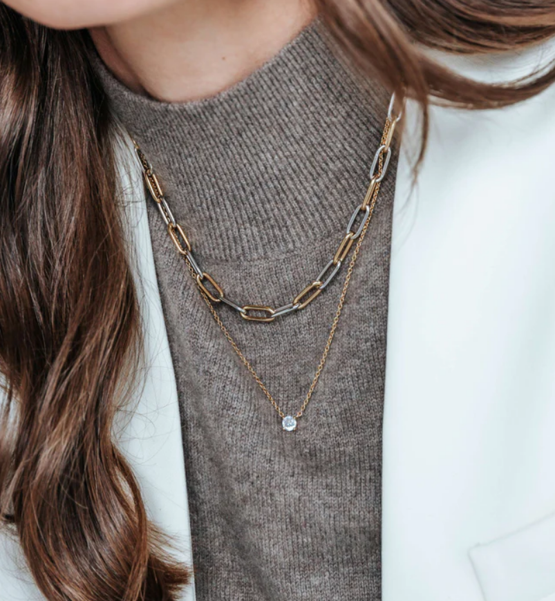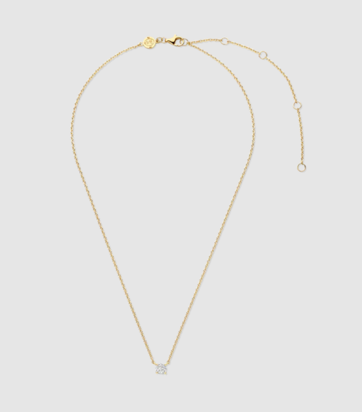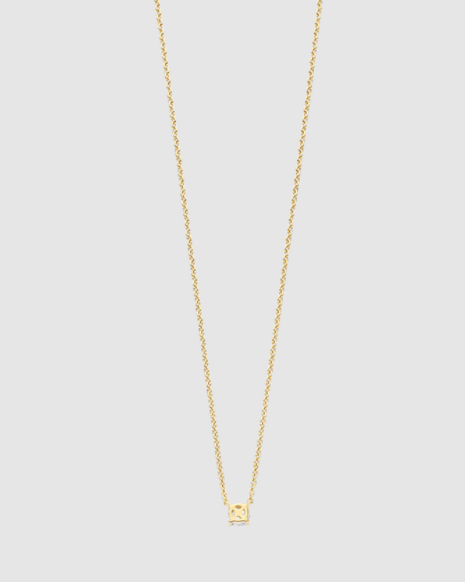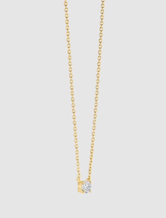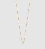 Tento elegantný náhrdelník je nevyhnutnosťou pre milovníčky minimalistických šperkov. Jeden briliantovo biely kubický zirkón je elegantne osadený v jemnom hrote a zavesený na jemnej pozlátenej retiazke. Jeho nadčasová silueta zachytáva svetlo s každým pohybom a vyžaruje tichú eleganciu.