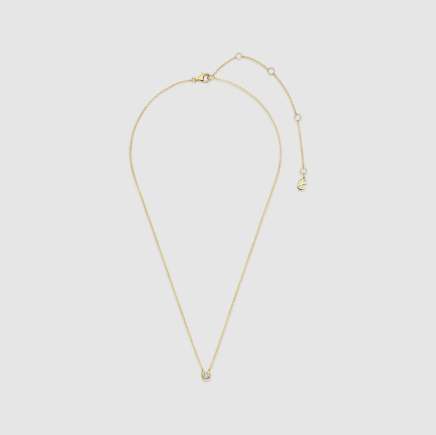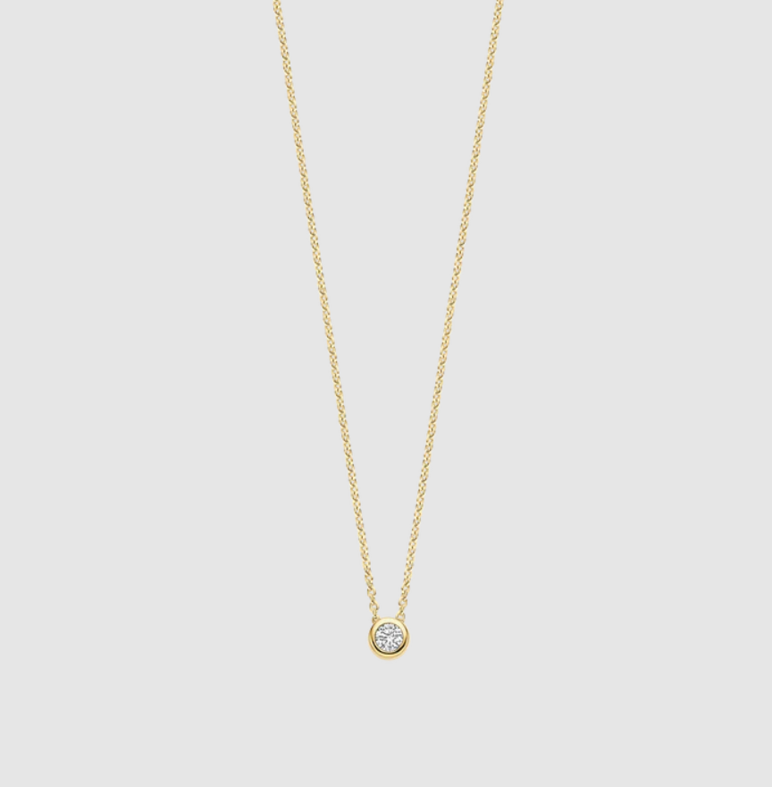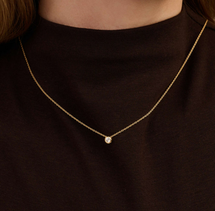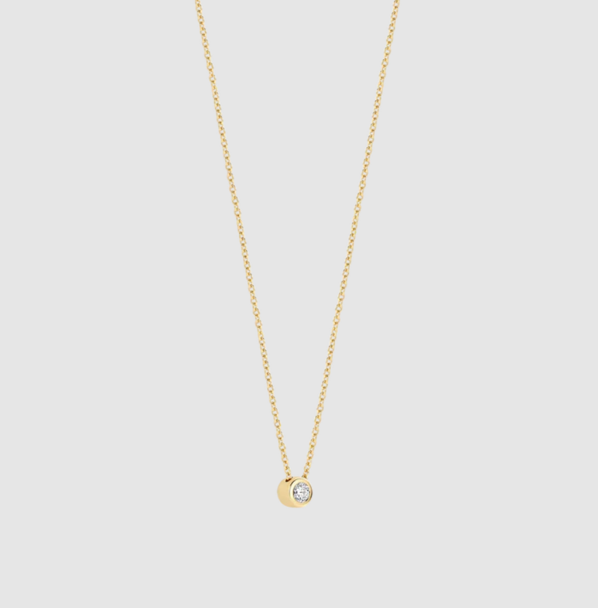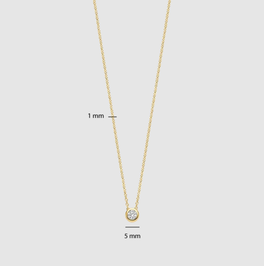 Tento náhrdelník má centrálne umiestnený zirkónový kameň zasadený do okrúhleho 18-karátového zlatého vermeilu. Rafinovaný dizajn vytvára jemný akcent na výstrihu, zatiaľ čo zirkón jemne zachytáva a odráža svetlo. Okrúhle osadenie dodáva náhrdelníku nadčasový a elegantný charakter.