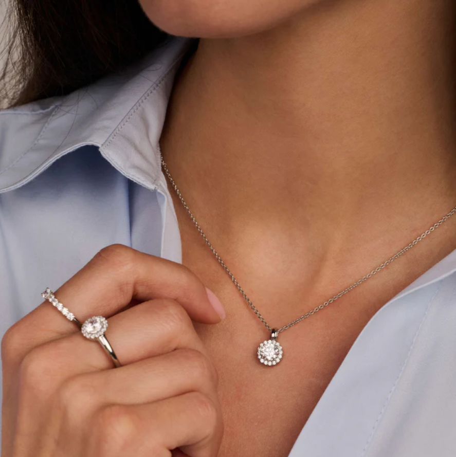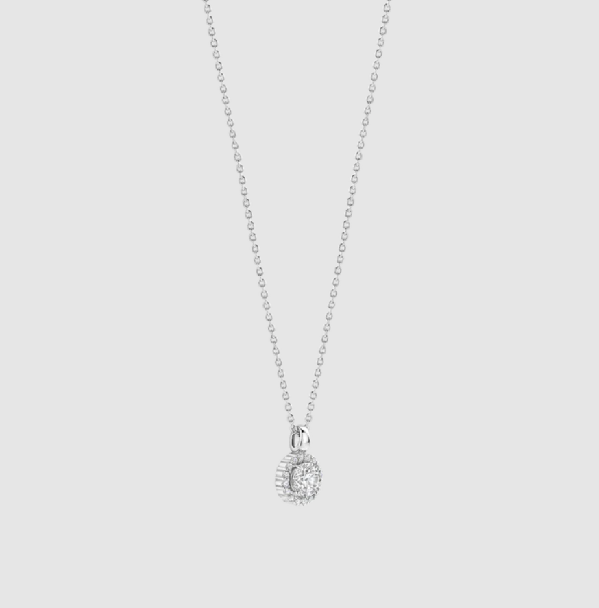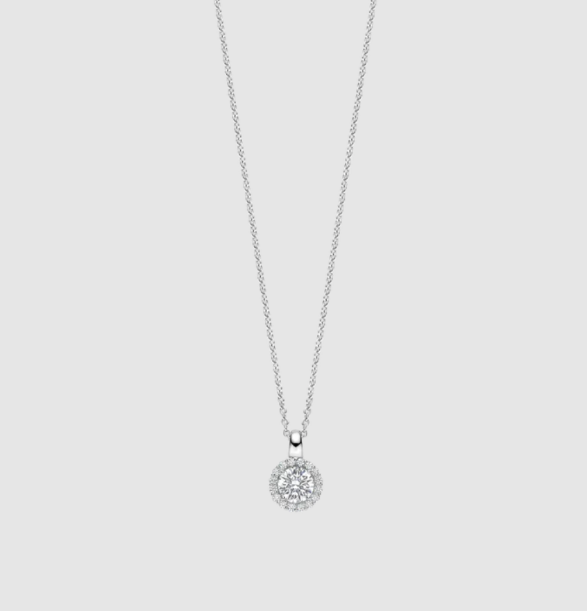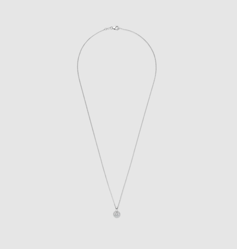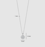 Tento strieborný náhrdelník so zirkónovým príveskom sa vyznačuje rafinovaným, klasickým dizajnom. Prívesok pozostáva z veľkého centrálne umiestneného okrúhleho zirkónového kameňa, obklopeného jemným radom menších zirkónových kameňov. Toto vrstvené osadenie dodáva hĺbku a zvýrazňuje trblietavý efekt centrálneho kameňa.