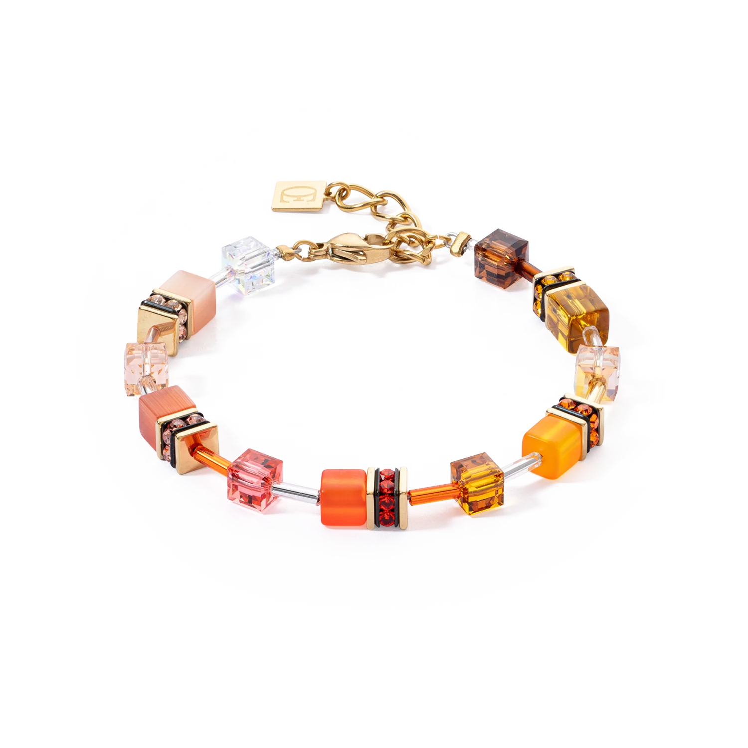 Náramok GeoCUBE Iconic Sunset Gold od značky Coeur de Lion je doslova stelesnením letného západu slnka zachyteného v šperku. Tento kúsok okúzľuje nádhernou kombináciou zlatých odleskov a hrejivých tónov, pripomínajúcich farebnú paletu zapadajúceho slnka. Dokonalé geometrické tvary zdobia prvky ako Swarovski krištále, syntetické tigrie oko a jemné polaris kamene, ktoré sa hravo trblietajú na svetle a pridávajú tomuto náramku neodolateľný lesk. Jeho dĺžka 18,5 cm s 3 cm predĺžením poskytuje flexibilitu nosenia a umožňuje prispôsobiť náramok na každú príležitosť, či už na luxusný večer alebo elegantné každodenné nosenie. Jemné krištálové rondely zvyšujú celkový dojem luxusu, pričom zlaté detaily z ušľchtilej ocele zabezpečujú dlhú životnosť.
