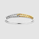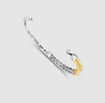 Výrazný dvojradový náramok sa vyznačuje dvoma plynulými krivkami: jedna je pokrytá lešteným žltým zlatom, druhá je pozlátená platinou a plne osadená pavé briliantovo brúsenými bielymi kubickými zirkónmi. Krivky sa navzájom spájajú v sochárskom uzle a vytvárajú rafinovaný kontrast medzi leskom a iskrou, pohybom a štruktúrou. Vďaka pántovému upevneniu pre bezpečné uchytenie obopína zápästie ako moderný architektonický prvok.