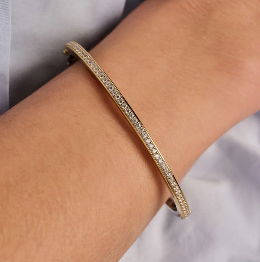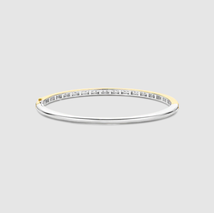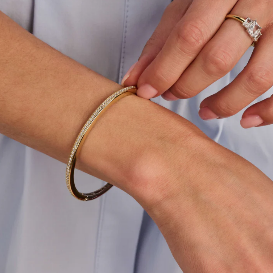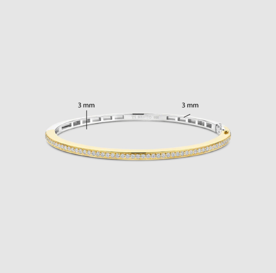 Tenký pozlátený náramok zakončený radom zirkónových kameňov, ktoré vytvárajú elegantný lesk a jemnú hru svetla pozdĺž zápästia sa bez námahy hodí k ostatným šperkom ako decentné zavŕšenie celku. Teplý zlatý odtieň dodáva náramku luxusný nádych. Zapínanie je bezproblémovo integrované do dizajnu, vďaka čomu náramok krásne sedí na zápästí s neprerušovanou siluetou.
