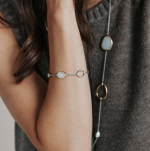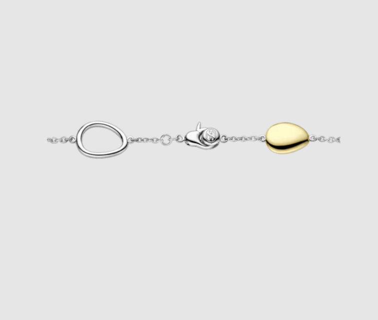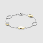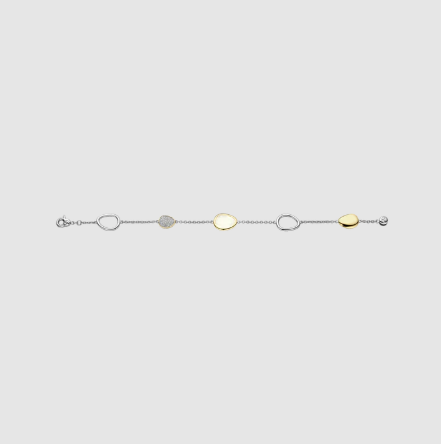 Jemná retiazka s chladným platinovým leskom je zvýraznená piatimi kamienkovými prvkami: mliečne biely kameň orámovaný žiarivým žltozlatým prevedením, leštený žlto-zlatý akcent, zrkadlovo lesklý platinový kamienok a pavé disk osadený briliantným bielym kubickým zirkónom. Spoločne vytvárajú rytmickú hru farieb, svetla a priestoru, ktorý pôsobí ležérne aj rafinovane.