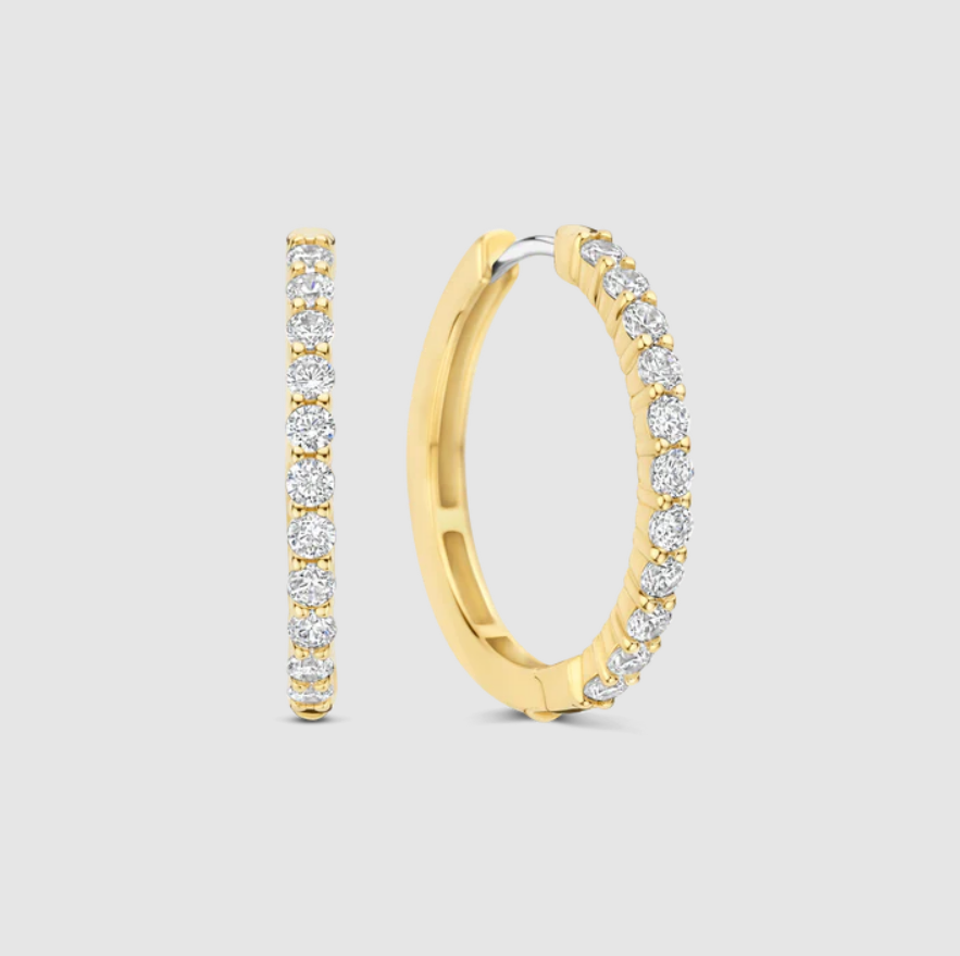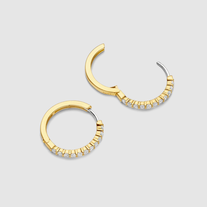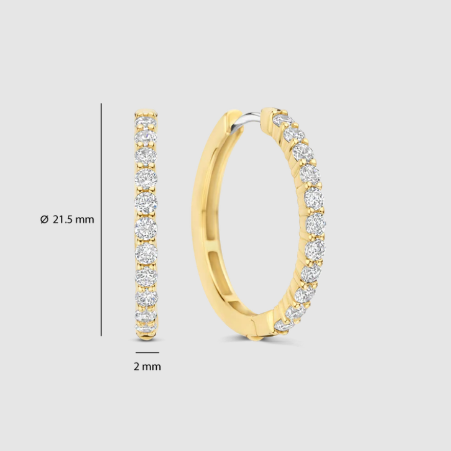 Tieto pozlátené tenisové krúžky sú kompletne osadené briliantovými zirkónovými kameňmi, ktoré silno odrážajú svetlo. Teplý zlatý odtieň dodáva dizajnu hĺbku a lesk. Dodávané sú v krásnom originálnom balení, čo z nich robí vyborný darček pre Vašu milovanú osobu alebo pre seba samú. Neobsahujú nikel a sú hypoalergénne. TI SENTO – Milano je značkou pre ženy, ktoré si cenia eleganciu, kvalitu a štýl vo svojich šperkoch a sú pripravené vyjadriť svoju osobnú krásu prostredníctvom týchto nádherných kúskov.