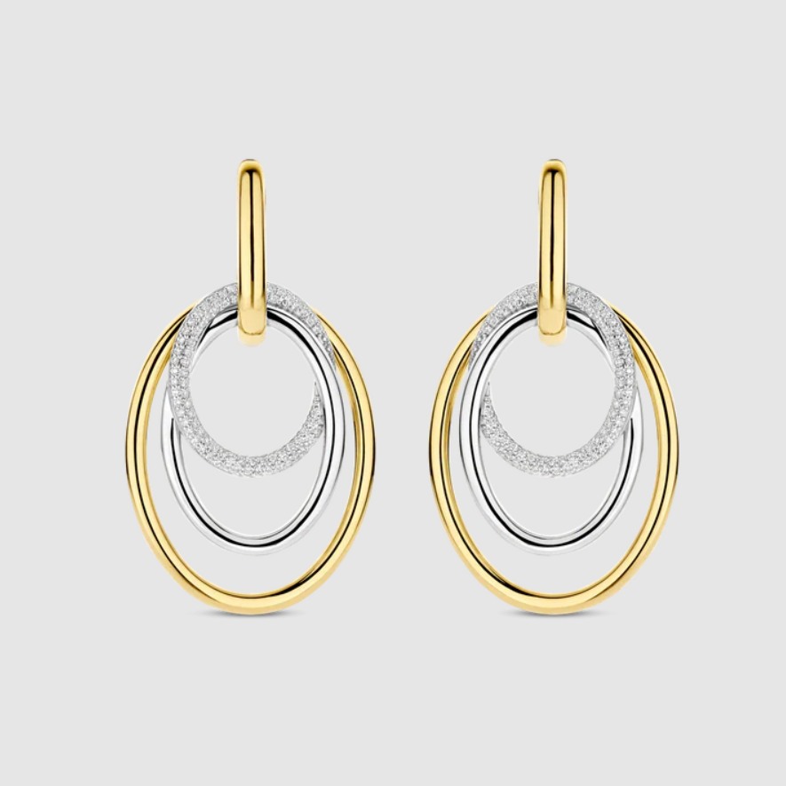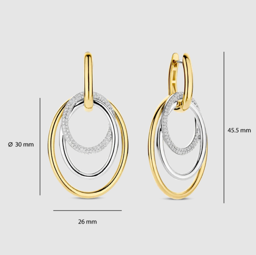 Kruhové náušnice Layered Structure Hoops sú výrazné náušnice zakončené detailmi z 18-karátového zlata vermeil. Každá kruhová náušnica má tri väčšie prepletené krúžky: jeden krúžok z 18-karátového zlata vermeil, jeden hladký strieborný krúžok a jeden krúžok osadený trblietavými zirkónovými kameňmi. Súhra materiálov a povrchových úprav dodáva náušniciam luxusný, vrstvený charakter.