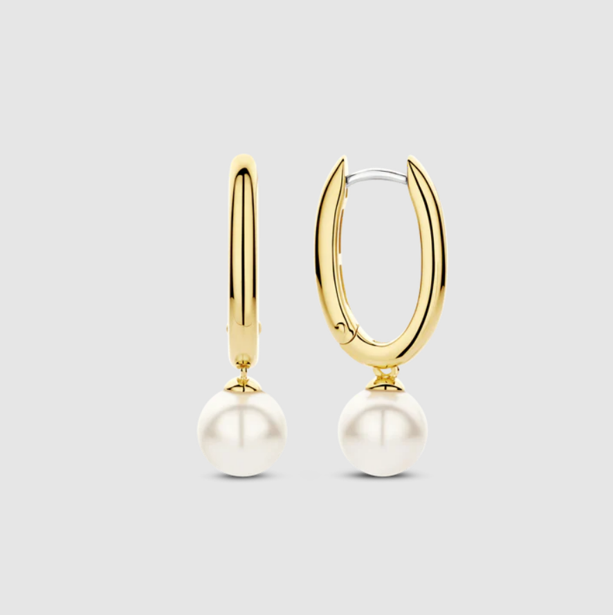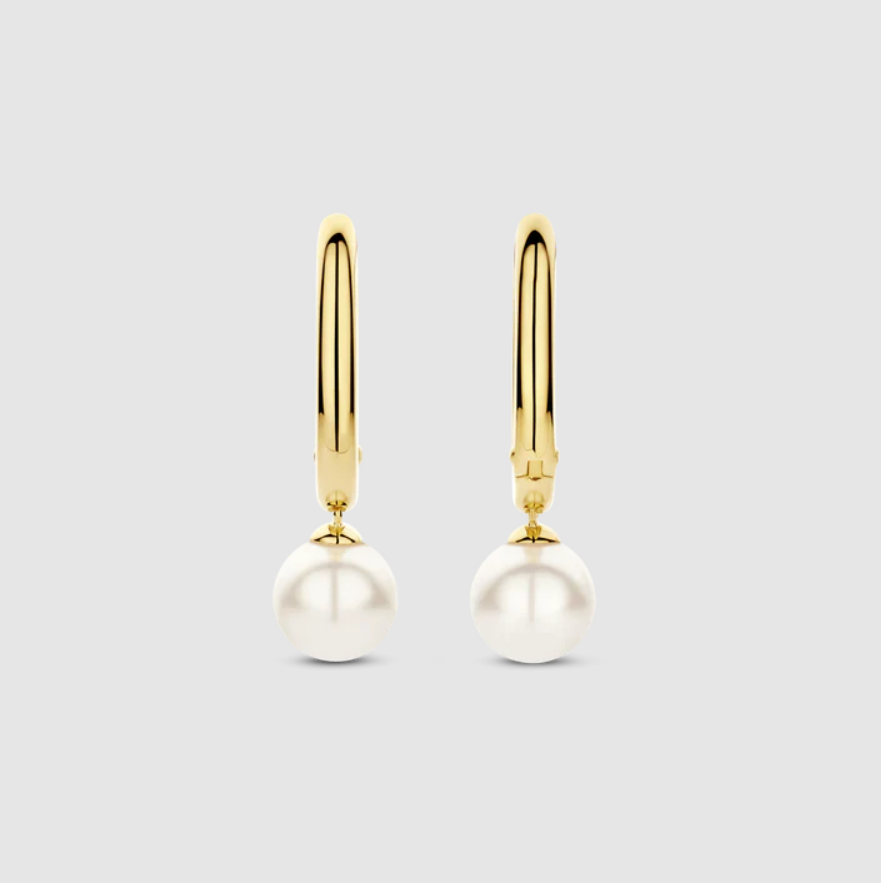 Náušničky s 8 mm bielou perlou zavesenou na elegantnom žltom pozlátenom krúžku, ktorý vytvára rafinovanú siluetu pôsobiacu nadčasovo a sviežo. Vyžaruje jemnosť a eleganciu v každom detaile.