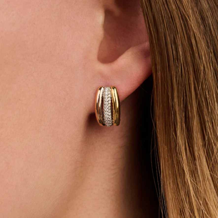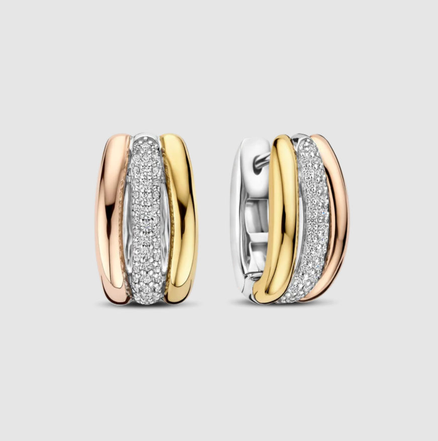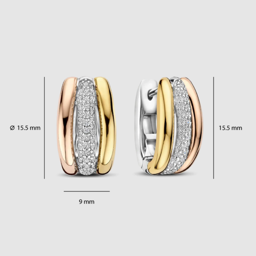 Tieto trojité kruhové zirkónové krúžky sa vyznačujú rafinovanou kombináciou 18-karátového zlata vermeil, pozláteného ružovým zlatom a kruhu osadeného trblietavými zirkónovými kameňmi. Tri kruhy elegantne ležia vedľa seba a vytvárajú vrstvený efekt s jemným kontrastom. Rad zirkónových kameňov zachytáva svetlo pri každom pohybe a dodáva im rafinovaný lesk. S priemerom 15 mm ponúkajú tieto krúžky dokonalú rovnováhu medzi eleganciou a každodenným nosením.