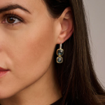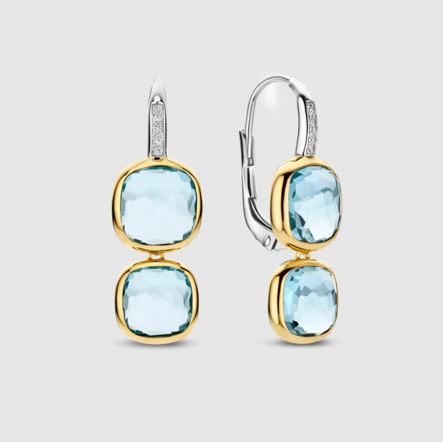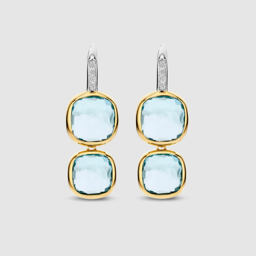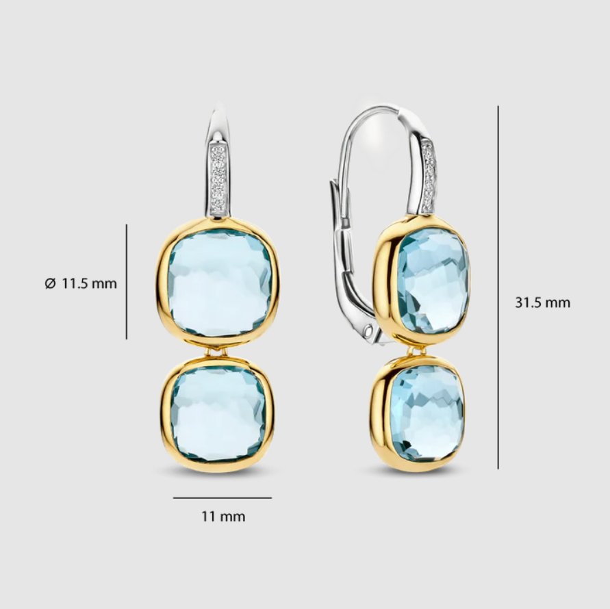 Náušnice s dvojitým vankúšikom sú osadené vermeilovým 18-karátovým zlatom. Dizajn sa vyznačuje rafinovanou kruhovou stuhou osadenou trblietavými zirkónovými kameňmi, z ktorých sú zavesené dva svetlomodré kamene s vermeilovým brusom. Kombinácia jedného väčšieho a jedného o niečo menšieho vankúšikového kameňa vytvára hravý vrstvený efekt, ktorý umožňuje, aby sa svetlo krásne odrážalo cez fazetované povrchy.