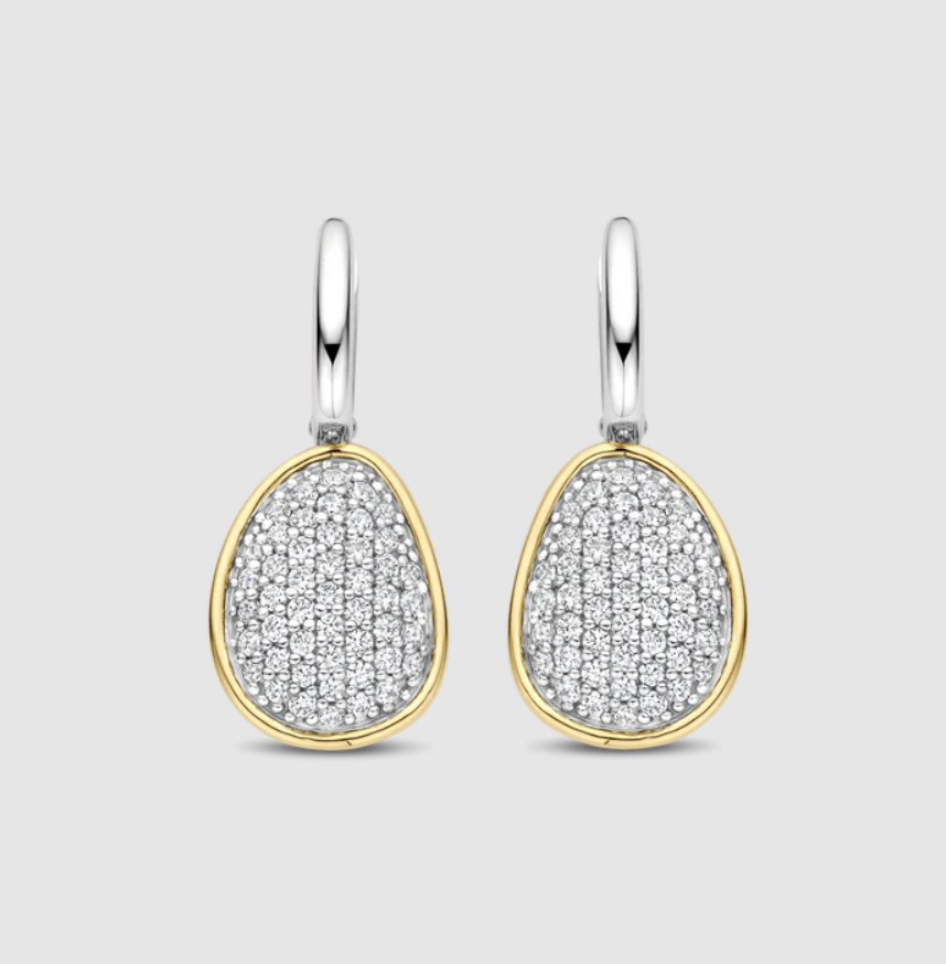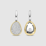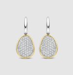 Náušničky prechádzajú do organického tvaru kamienka, lemovaného žiarivým žlto-zlatým okrajom. Stred je celý osadený pavé briliantovo brúsenými bielymi kubickými zirkónmi, ktoré vytvárajú koberec svetla, ktorý sa mení s každým otočením hlavy. Noste ich samostatne pre výrazný lesk alebo ich skombinujte s jemnými napichovacími náušnicami a vytvorte vrstvený vzhľad bohatý na textúru a tón.
