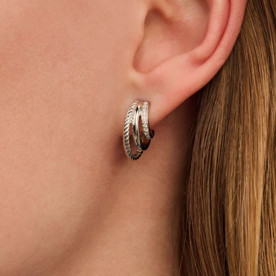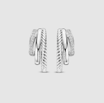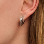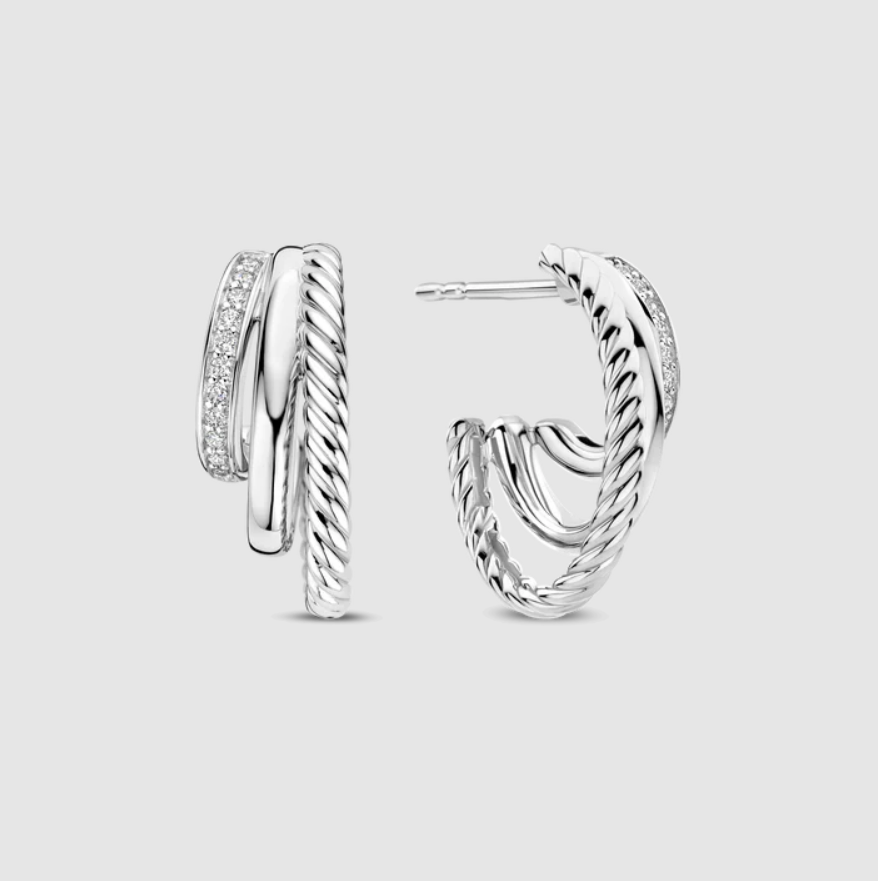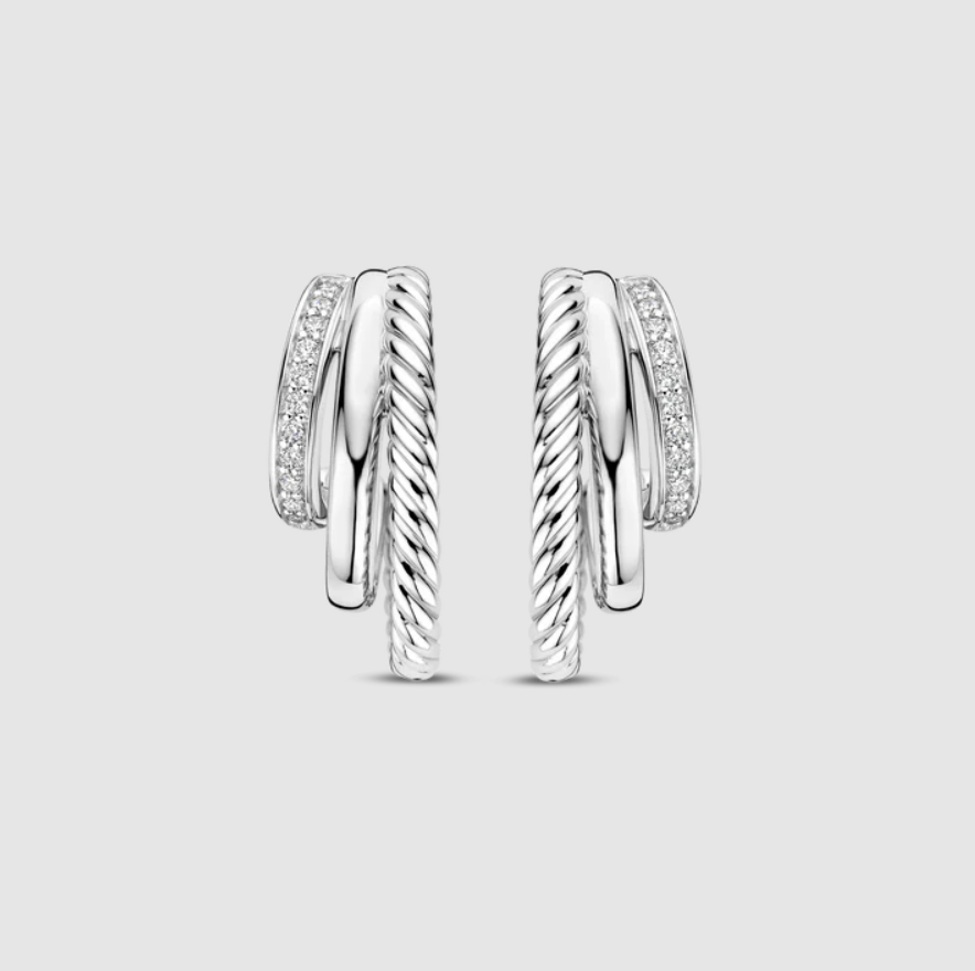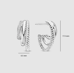 Tieto náušničky pozostávajú z troch prúžkov rôznych veľkostí, pričom každý má svoju vlastnú textúru. Jeden prúžok je hladký, jeden má rebrovanú textúru a jeden je osadený starostlivo umiestnenými zirkónovými kameňmi. Kombinácia štruktúr vytvára hĺbku a rafinovanú hru svetla, zatiaľ čo zirkón jemne zachytáva svetlo pri každom pohybe.