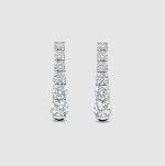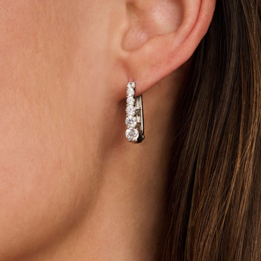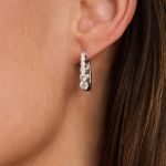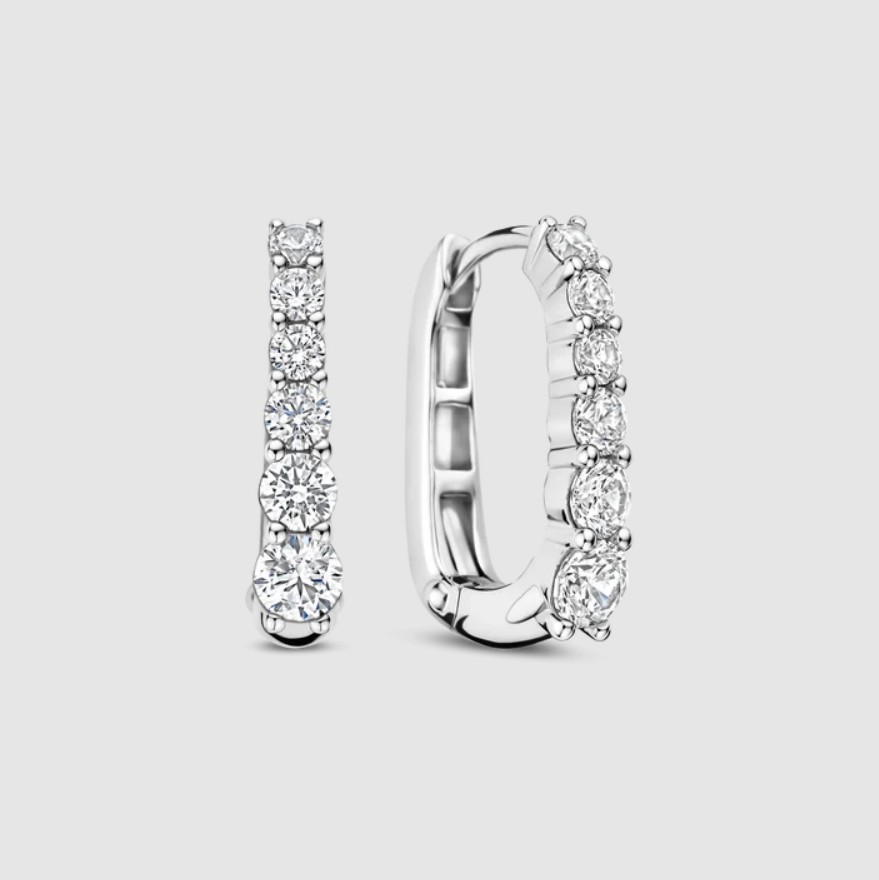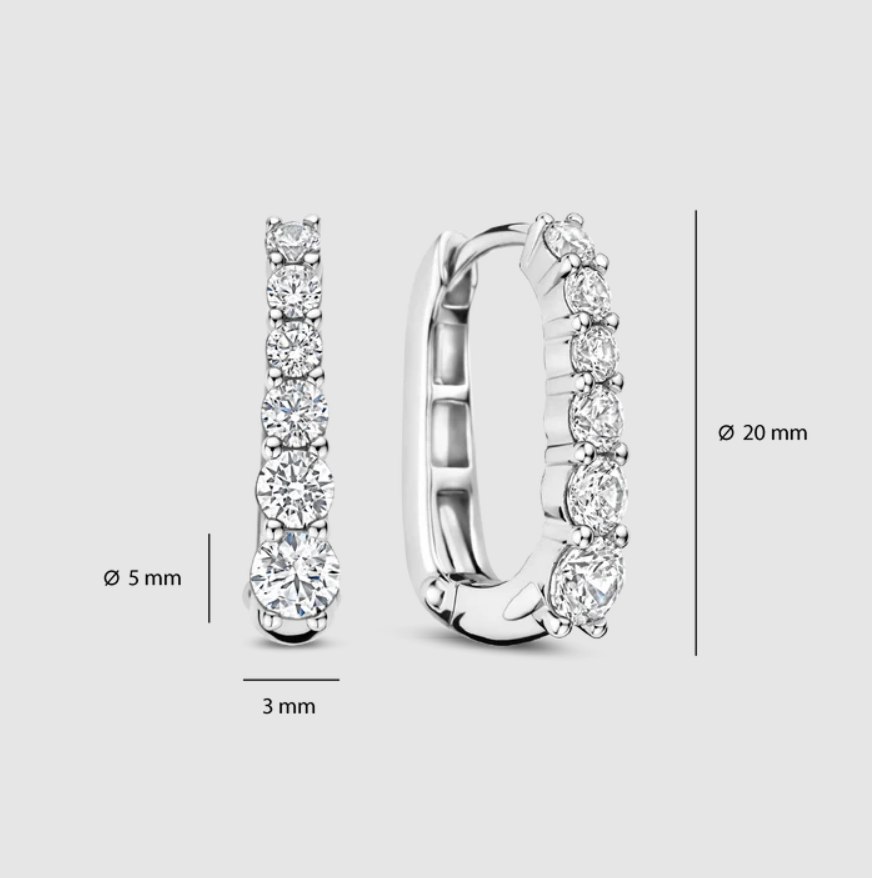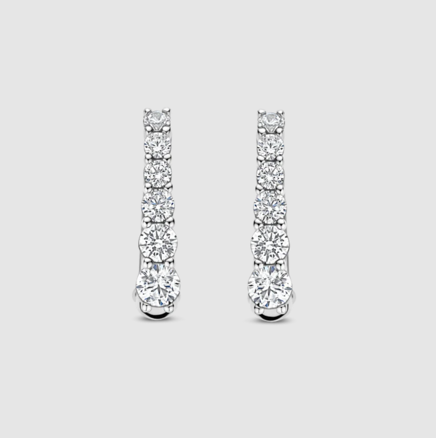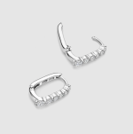 Tieto elegantné strieborné náušničky v oválnom tvare sú osadené briliantovými zirkónovými kameňmi, ktoré sa postupne zväčšujú a vytvárajú rafinovanú a dynamickú hru svetla. Oválny tvar im umožňuje jemne padať pozdĺž ucha s elegantnou siluetou. Rovnováha medzi štíhlym dizajnom a trblietavými kameňmi robí tieto klasické náušnice vhodnými na každodenné nosenie, ako aj na formálnejšie príležitosti.