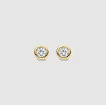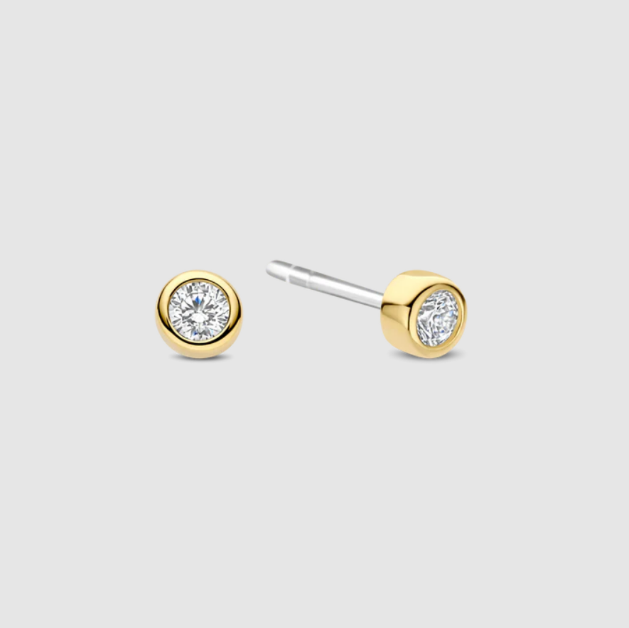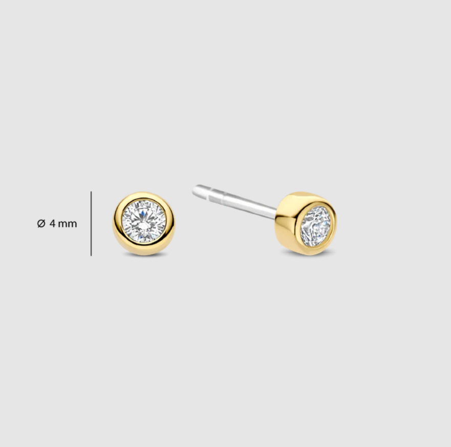Tieto klasické zirkónové náušnice sú osadené 18-karátovým zlatom vermeil. Číry zirkón je umiestnený v okrúhlom osadení, ktoré poskytuje jemný, teplý lesk a nadčasový vzhľad.