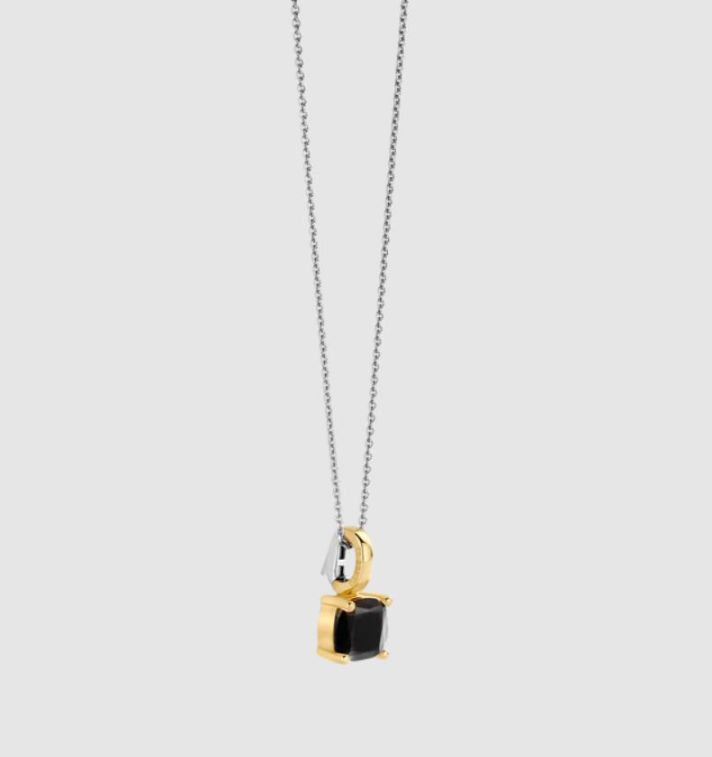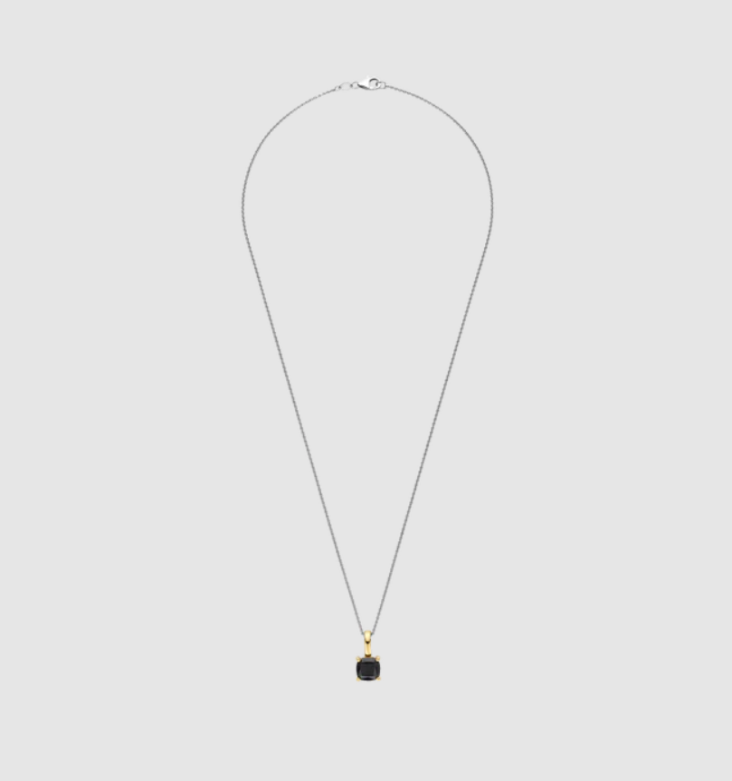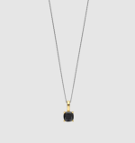 Tento minimalistický kúsok sa vyznačuje 8 mm čiernym kameňom v tvare vankúšika, ktorý je zasadený do nadčasového štvorcípeho osadenia, vďaka čomu jeho hlboký tón púta pozornosť. Prívesok je ohraničený s teplým žltozlatým pokovovaním a je zavesený na elegantnom platinovom pokovovanom pútku. Jeho čisté línie a výrazná farba vytvárajú všestranný kúsok, ktorý sa bez problémov hodí k dennému aj večernému outfitu.