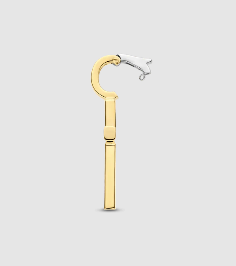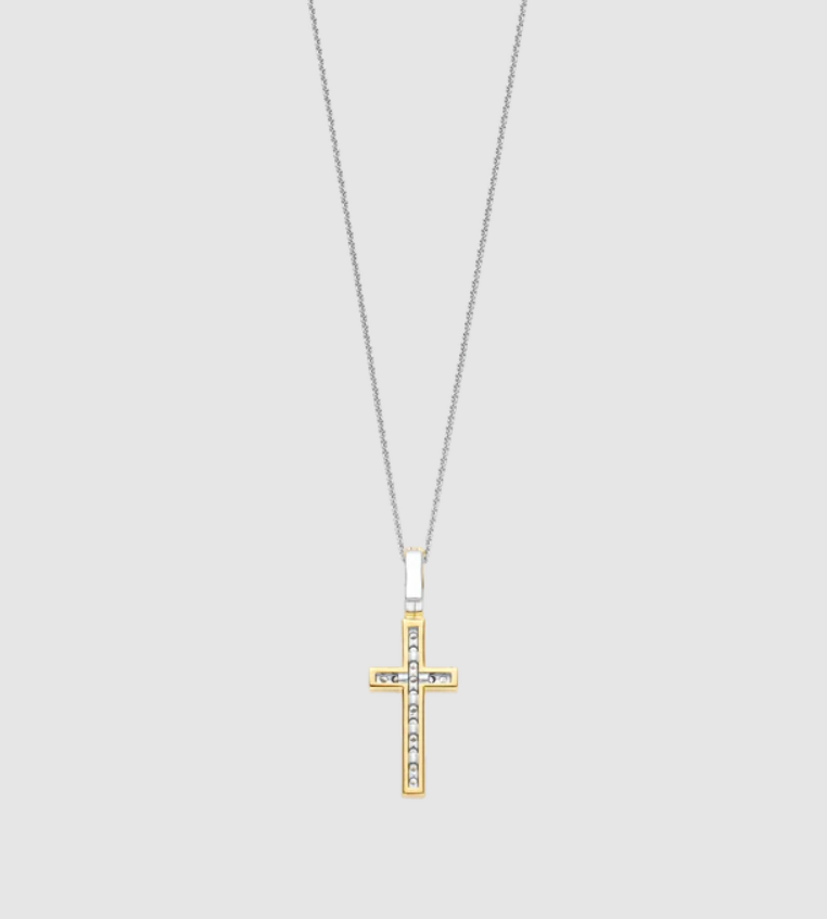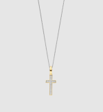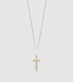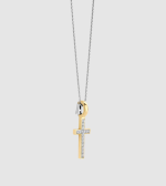 Pozlátený prívesok so siluetou kríža so žiarivým žltým zlatom, osadený brilantným kubickým zirkónom, ktorý sa trblieta tichou silou a čistotou. Kontrast medzi teplým zlatom a žiarivými kameňmi prináša nadčasovú symboliku do rafinovanej rovnováhy.