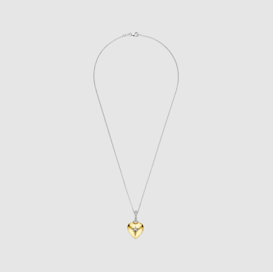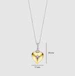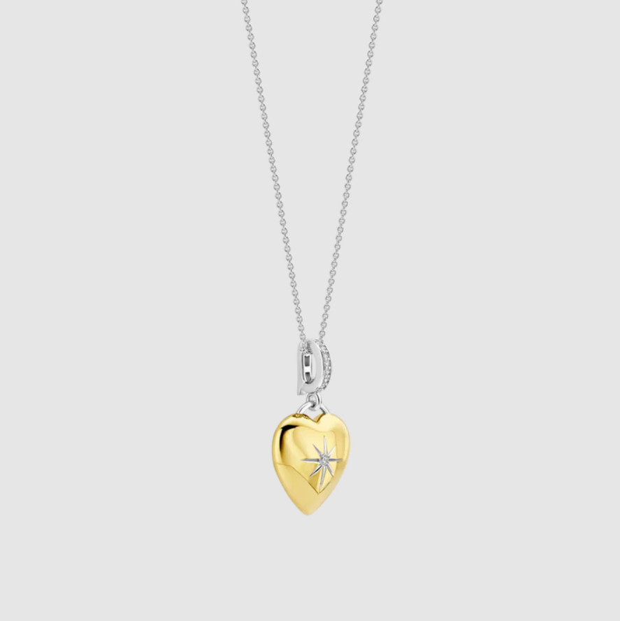Tento náhrdelník v tvare srdca je z 18-karátového zlata vermeil. Srdce je zušľachtené zirkónovými detailmi vrátane centrálneho zirkónového akcentu, ktorý pri každom pohybe zachytáva svetlo a vytvára jemný trblietanie. V strede srdca zirkónový detail tvorí motív kríža, ktorý dodáva dizajnu hĺbku a rafinovanú štruktúru. Náhrdelník je dodávaný s tenkou striebornou retiazkou, ktorá umožňuje, aby prívesok krásne ležal na výstrihu.