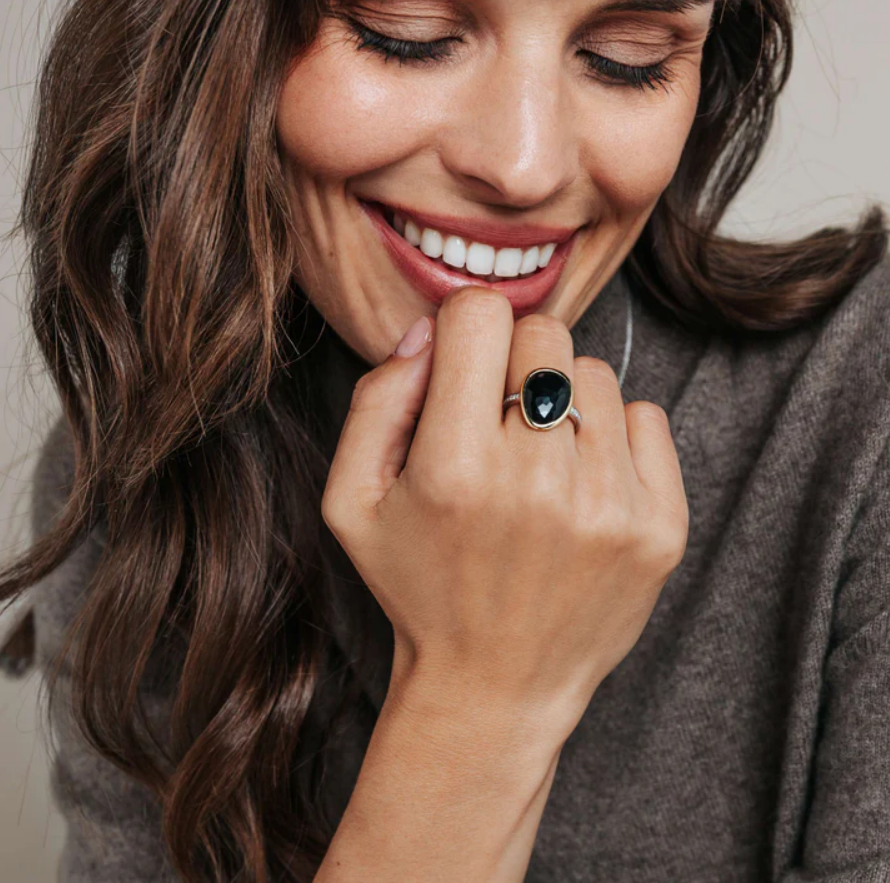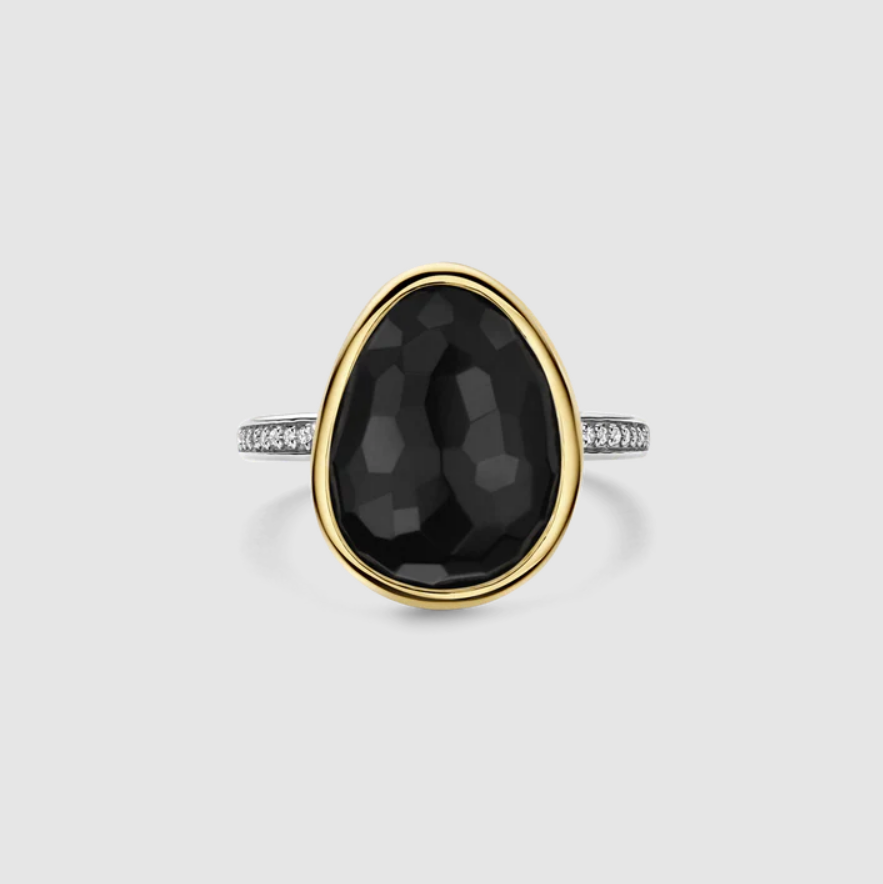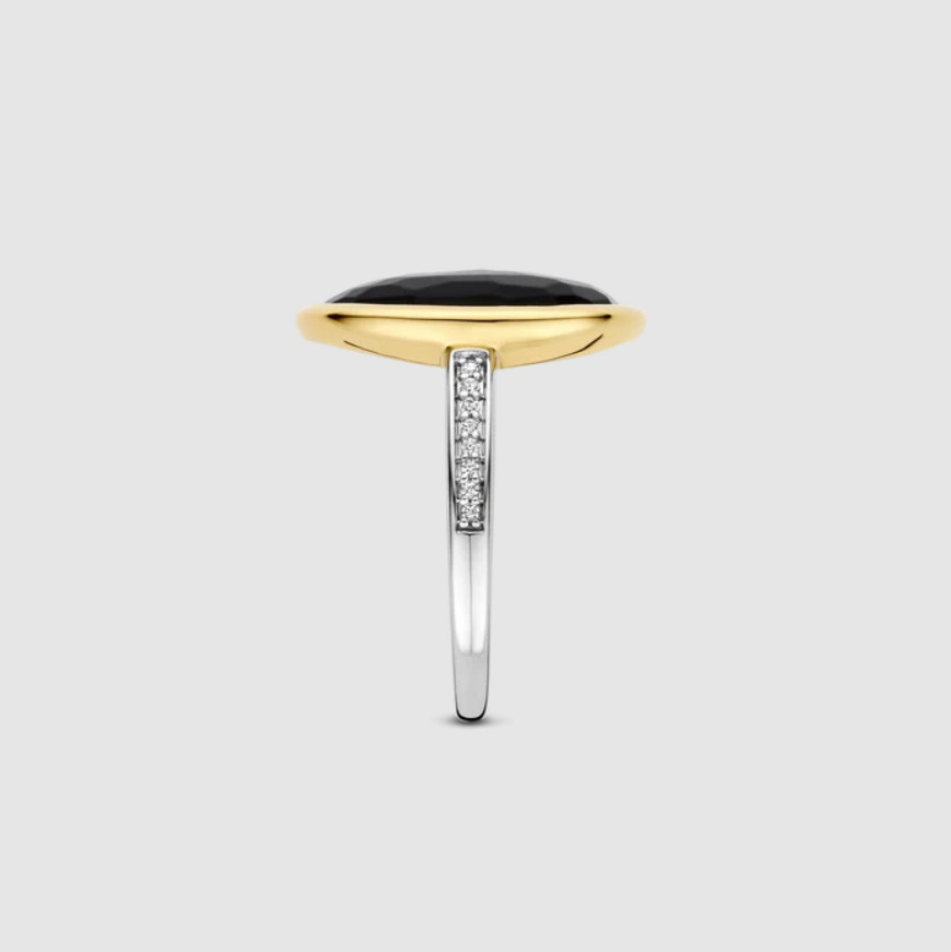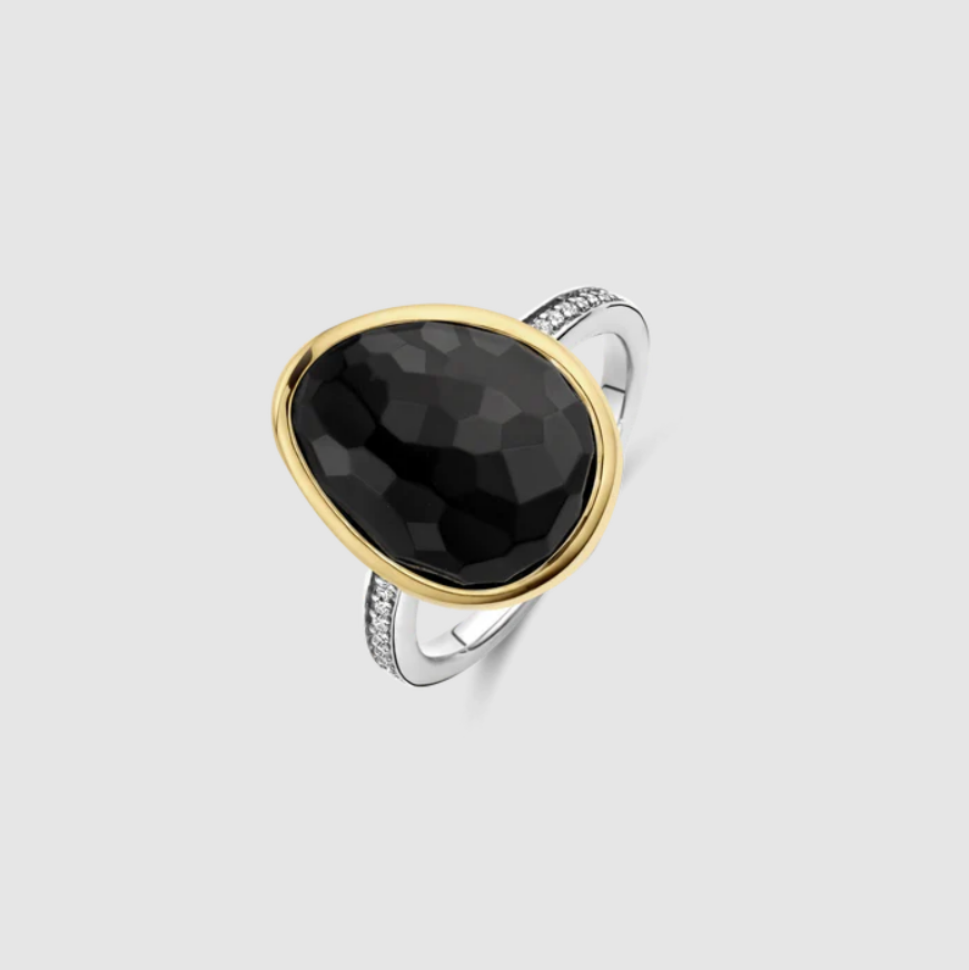 Objavte polnočné čaro s týmto pozláteným prsteňom zo striebra, zatesnený zrkadlovo lesklou platinovou povrchovou úpravou. Štíhly prsteň vedie pohľad k organicky tvarovanému čiernemu kameňu, ktorého fazetovaný „kamienkovaný“ povrch sa trblieta v jemných zábleskoch svetla. Hladký, žlto – zlatý okraj lemuje drahokam zatiaľ, čo zužujúci sa rad bielych kubických zirkónov osadených pozdĺž jedného ramena dodáva rafinovaný lesk bez toho, aby kradli pozornosť.