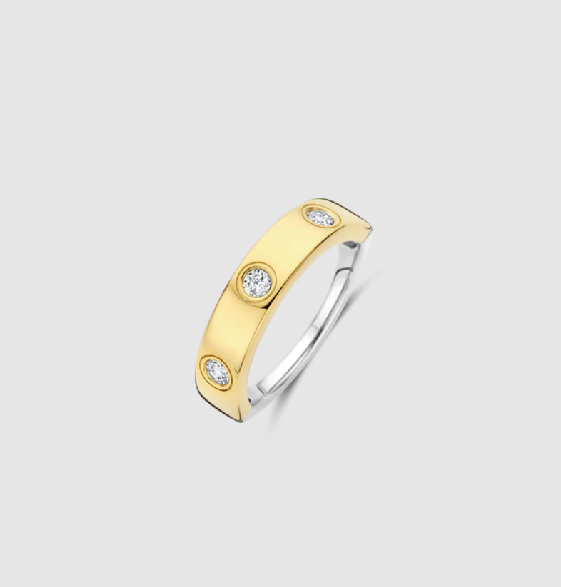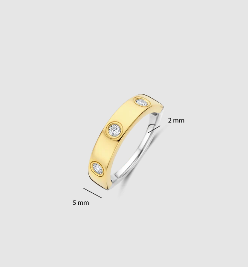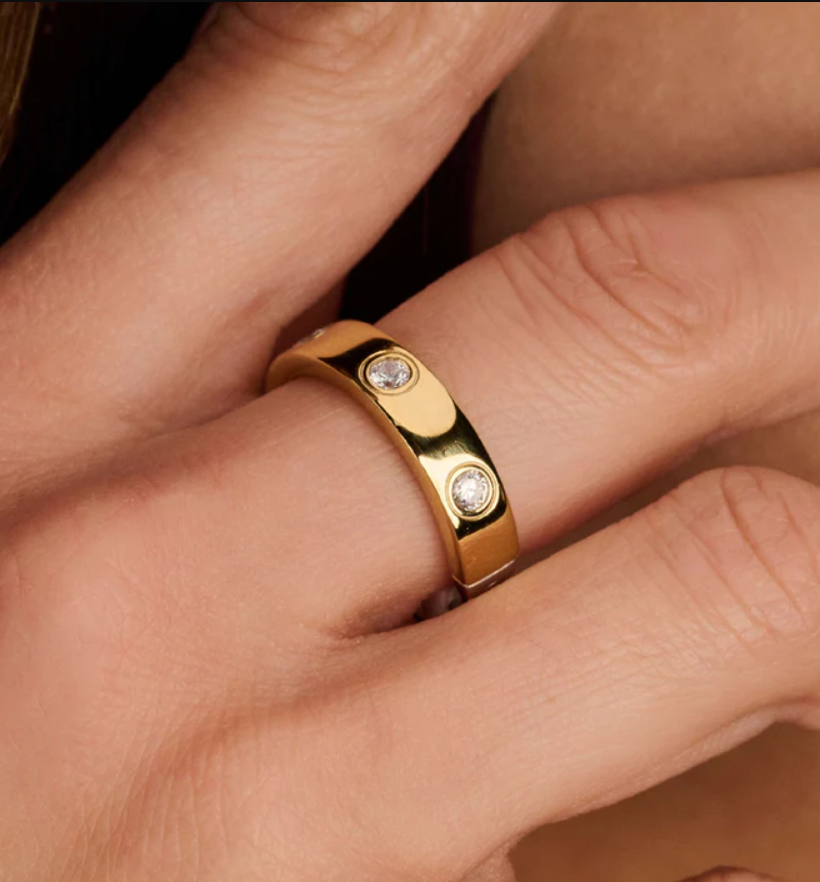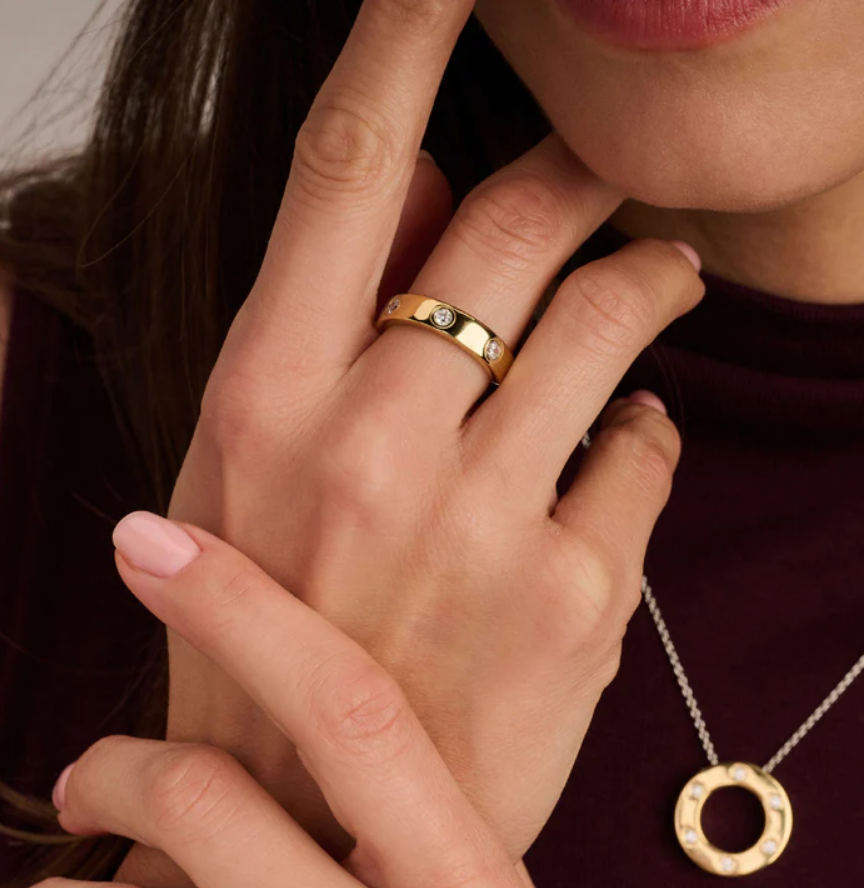 Tento 18-karátový zlatý prsteň s vermeilovými kameňmi sa vyznačuje výraznejšou, zaoblenou siluetou. Prsteň je zakončený niekoľkými okrúhlymi zirkónovými kameňmi, ktoré sú jemne zapustené do dizajnu a vytvárajú rafinovaný a elegantný lesk.